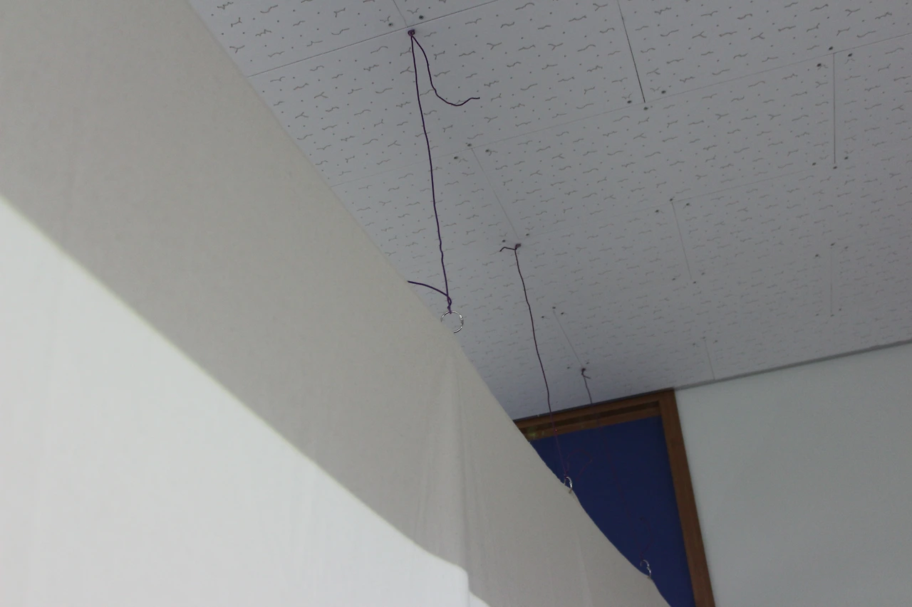 그다음 필요한 것이 그림자를 비출 막이었다. 광목을 사용하기로 하고 이곳저곳을 뒤져 가장 가격이 저렴한 곳을 찾아 20마 정도를 주문했다. 창고에 처박아 둔 재봉틀을 꺼내 드르륵 박아서 시접을 처리하고, 천정의 나사를 풀어 조소 수업을 하고 남은 전선을 고정시켜서 광목을 길게 달았다. 간신히 그림자 비출 막 해결.