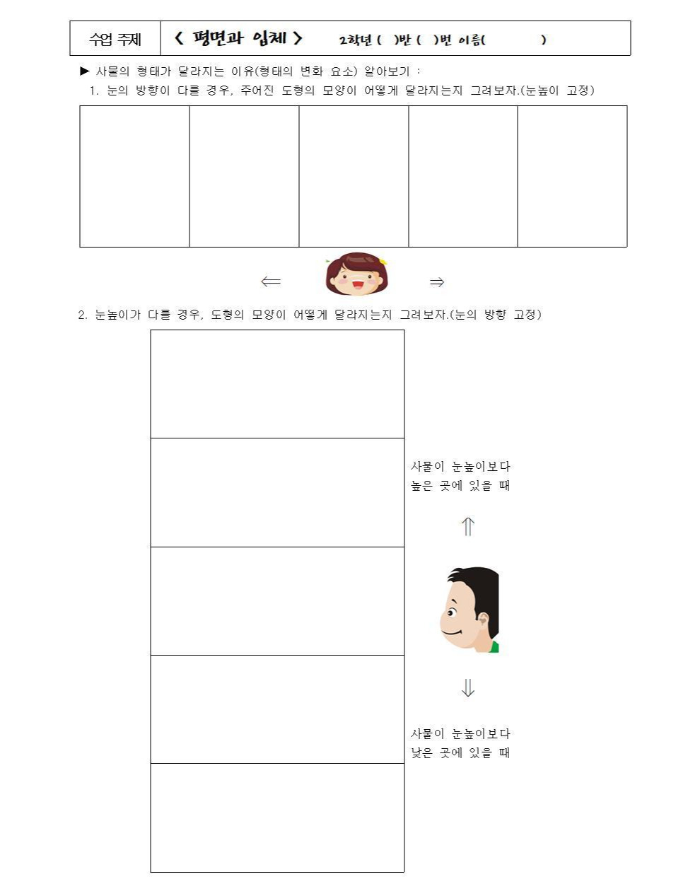 눈높이, 눈의 방향, 물체와의 거리를 형태의 변화 요인이라고 한다. 이 세 가지는 기말고사를 대비해서 이론으로만 가르치는 경우가 많다. (아마도 중고등학교 미술시간에 다들 한 번씩 외운 기억이 날 것이다.) 형태 변화 요인은 이론으로써가 아니라 사물을 관찰하기 위한 하나의 준거로서 제시되어야 하는데, 그렇지 못한 경우가 많았던 것이다. 사실, 이 세가지만 잘 이해해도 형태를 관찰하여 그리는 수업이 좀 더 쉬워질 것이지만, 현실적으로는 이를 이해하기 위해 따로 수업 시간을 할애하기 어려운 실정이다. 하지만, 무슨 생각이었는지 한 해에는 이 세 가지만을 위한 수업을 진행하기로 마음먹게 되었다. (아래 학습지 참조)