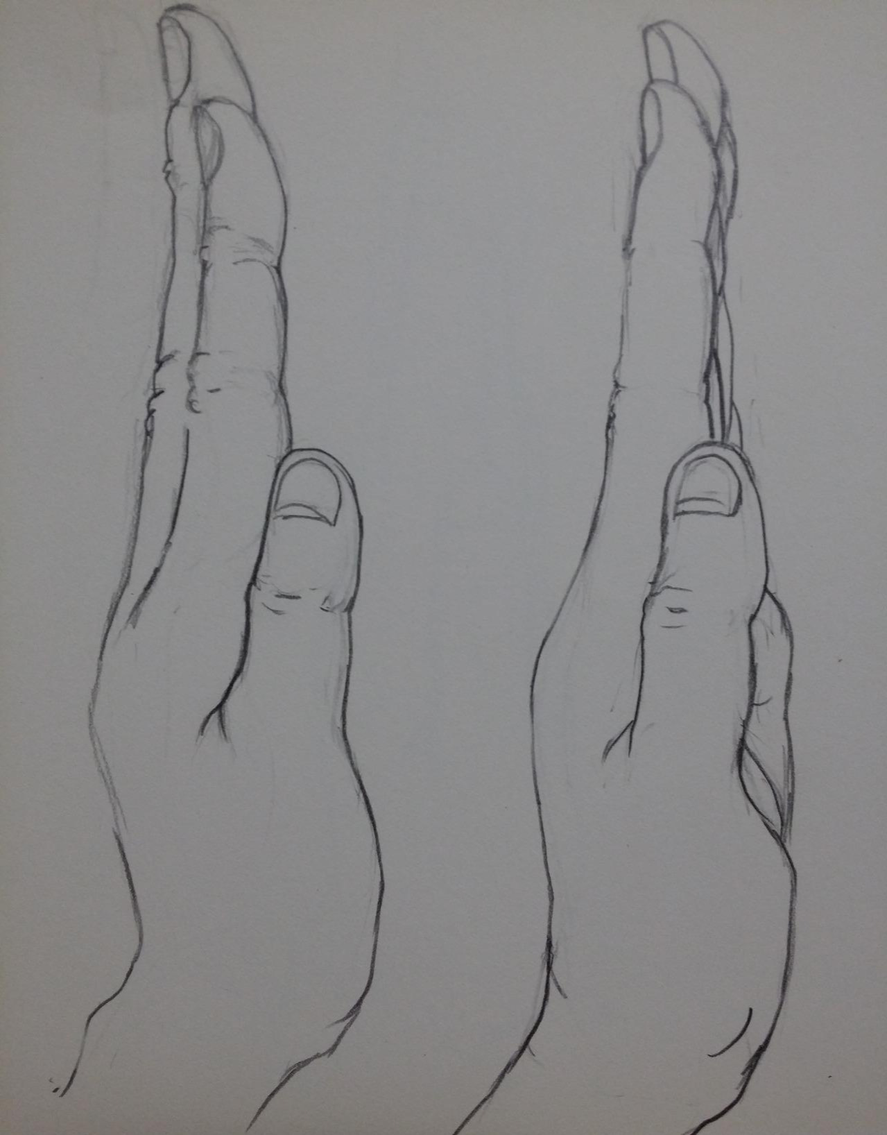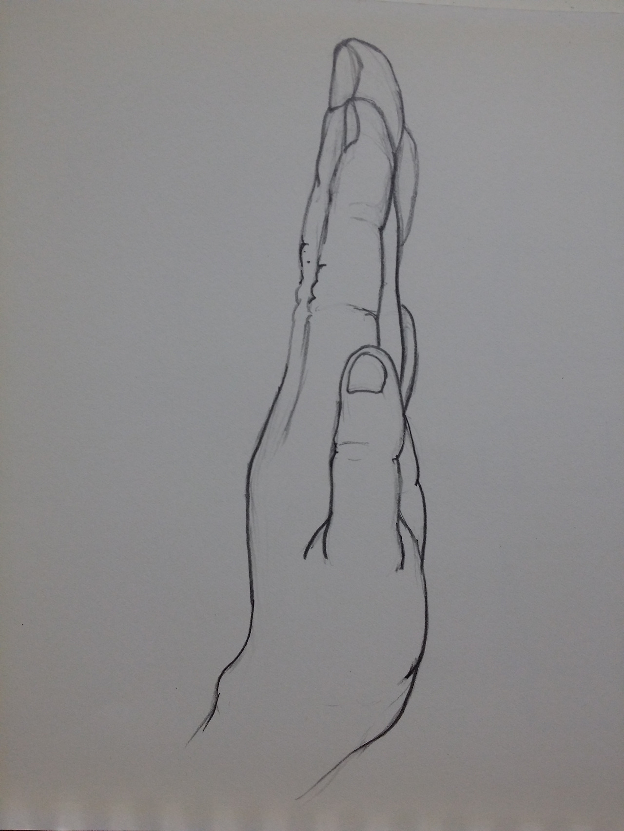 두 개의 눈으로 각각 사물의 형태를 파악한 후 이를 종합해서 거리나 깊이를 파악하는 것이 우리 눈이다. 사물과 눈과의 거리가 가까울수록 형태의 왜곡이 많이 일어난다. 하지만, 눈과 사물의 거리가 충분히 떨어져 있다면 카메라의 눈과 사람의 눈으로 본 형태는 거의 비슷해진다. 학생들은 젠가를 비교적 눈 가까이 놓고 그렸던 것 같다. (하지만, 아주 가깝지 않아도 형태의 왜곡은 충분히 볼 수 있다. 위의 손 그림도 눈에서 거의 30cm는 떨어져서 보고 그린 그림이다.)