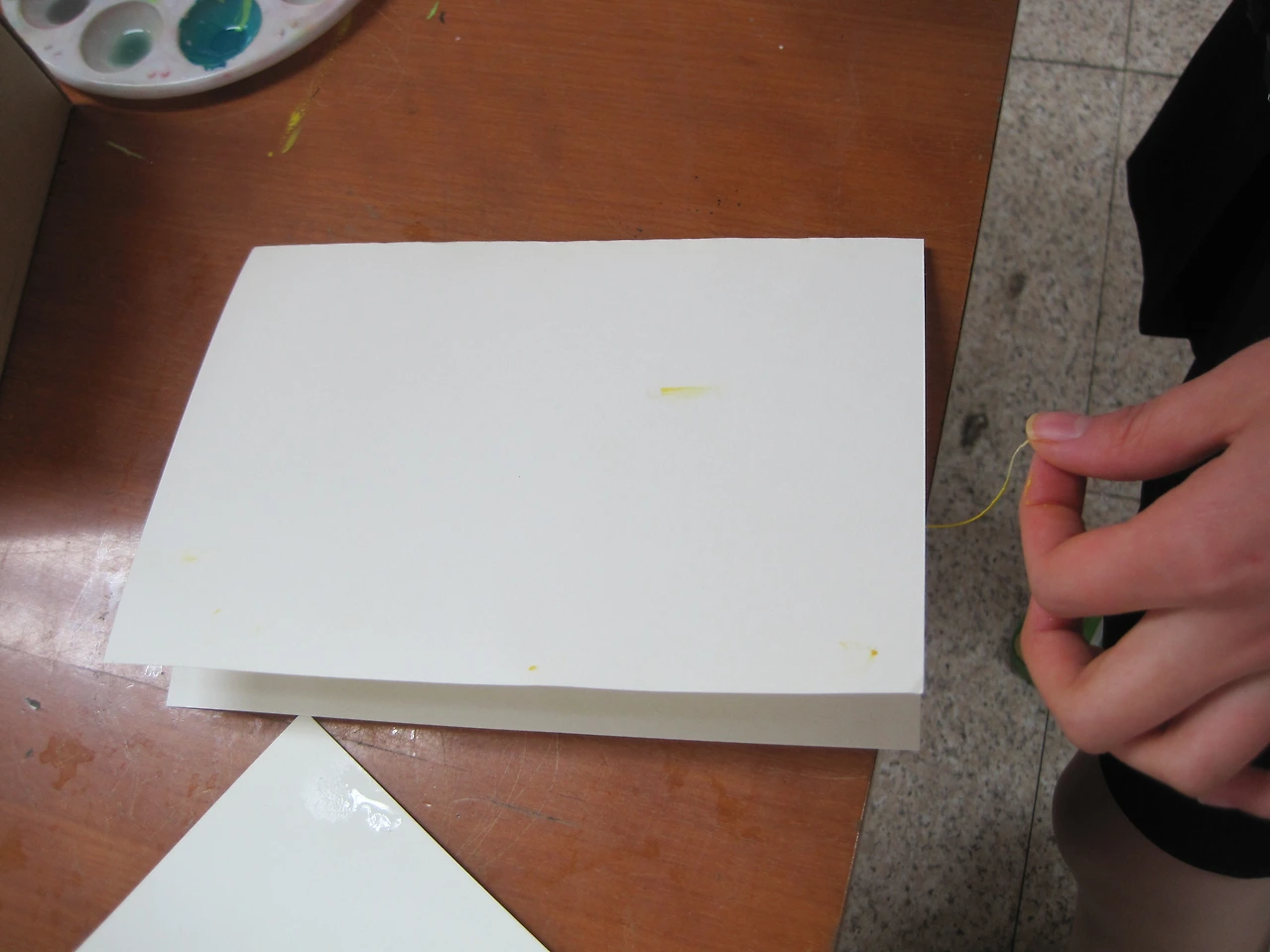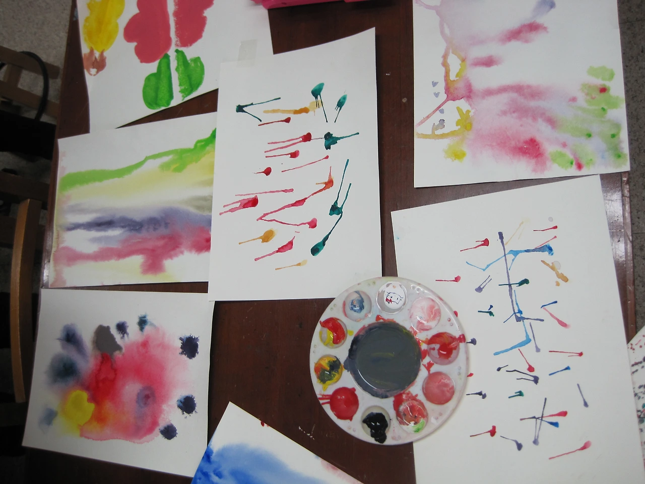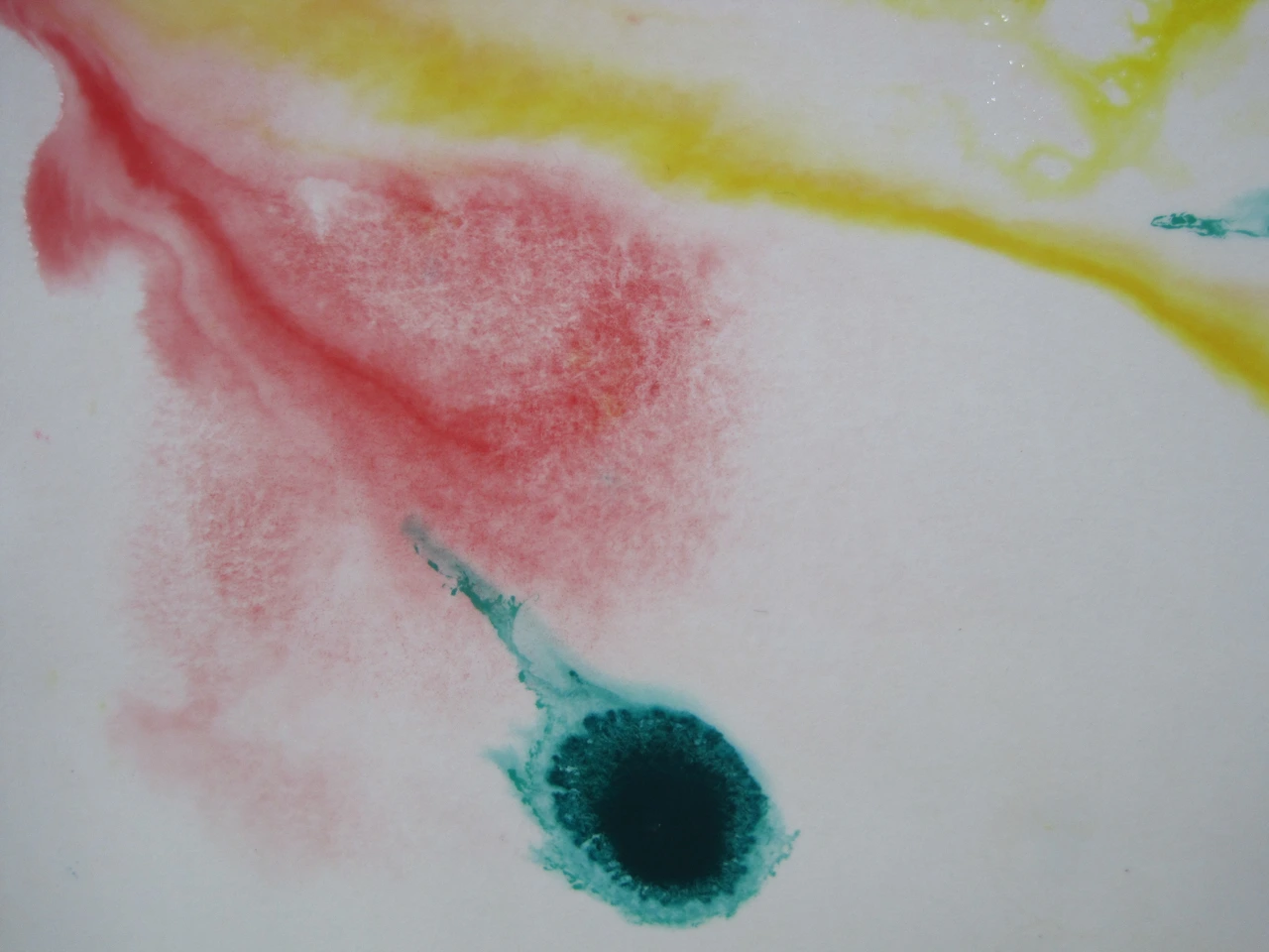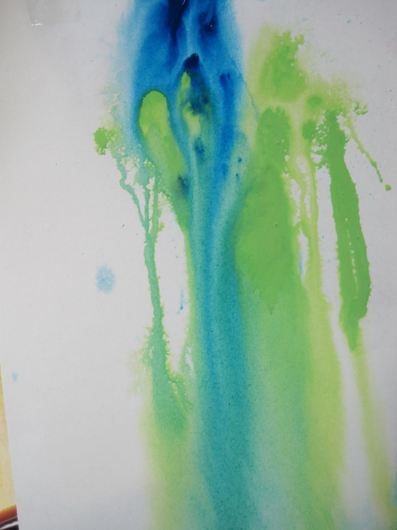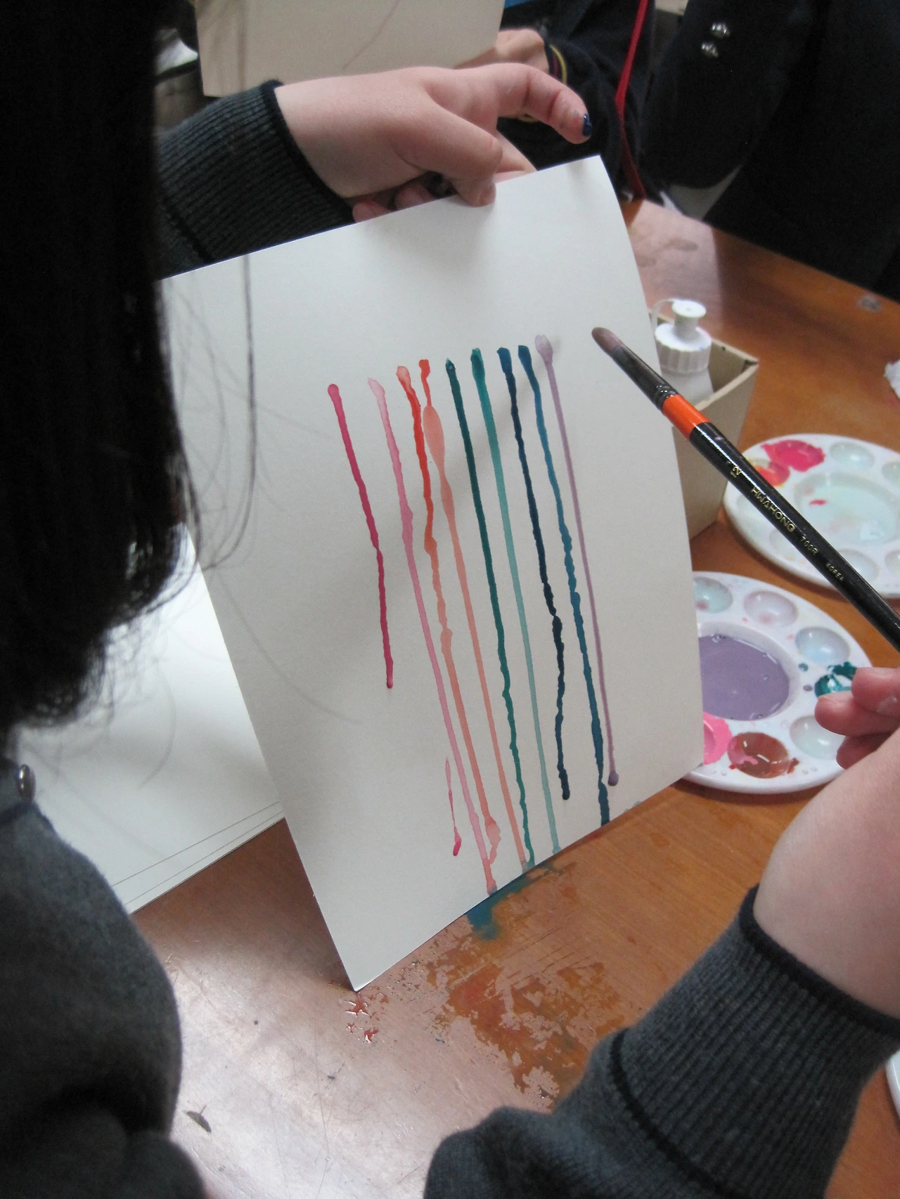 ② 도화지에 물을 묻히고 물감을 떨어뜨린 후 도화지를 기울이면 물감이 번지면서 흐른다. 흐른 자국이 안정될 때까지 기울이고 있어야 하며 어느 정도 안정되면 평평한 곳에 도화지를 놓고 말린다.