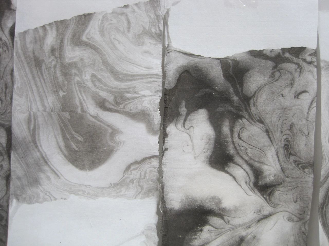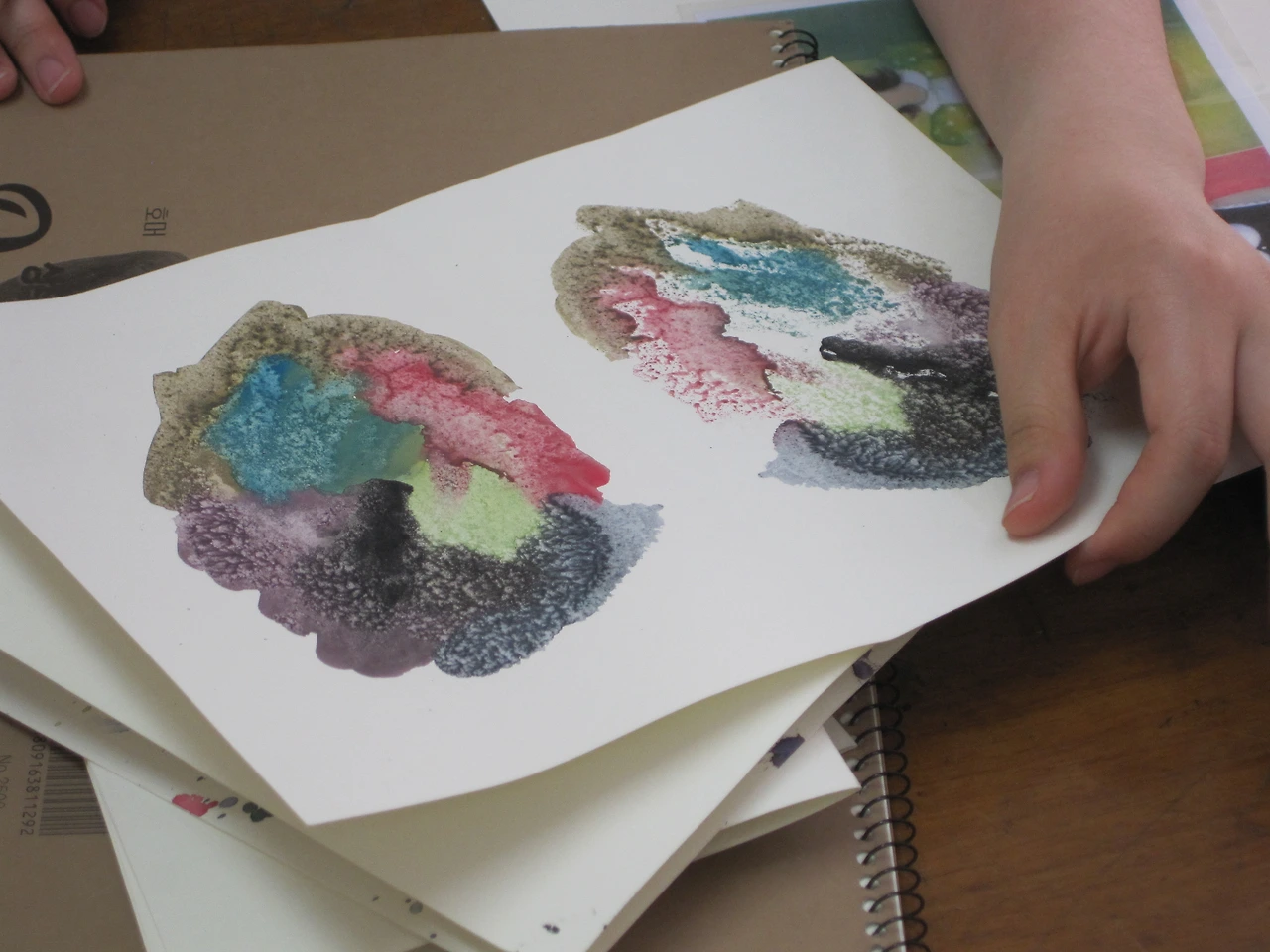 그 이유는 본 수업이 우연의 기법으로부터 추리, 연상을 통해 이미지와 이야기를 만듦으로써 상상력과 연상력을 키우기 위한 수업이기 때문이다. 만일 동화책을 만들 것임을 미리 알게 되면 학생들은 자신들의 구상에 맞게 표현을 조절하게 된다. 예를 들면, 물고기와 관련된 이야기를 떠올리면서 바닷속 느낌이 나도록 색채를 조절하는 식이다. 실제로, 제작과정에서 활동지를 분실한 학생에게 보충 활동을 허용했더니 위와 같이 한 경우가 있었다. 다만, 사후 활동이 있음을 미리 알고 있어야 표현 결과물을 버리지 않고 잘 간수하게 된다. 그림책 만들기에 대한 안내는 먹물 마블링까지 마친 후 수업 마무리 단계에서 안내하면 된다.