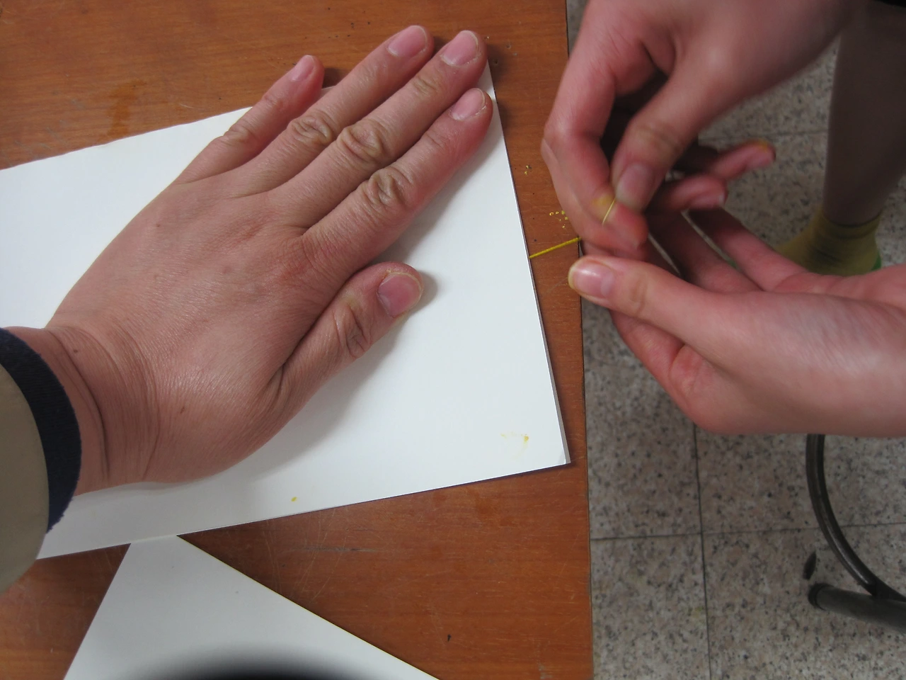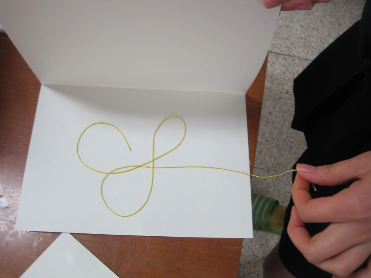 면실에 물감을 묻힌다. 반으로 접은 도화지 한쪽 면에 물감이 묻은 실을 내려놓고 도화지를 덮은 후 도화지를 손바닥으로 누른다. 이때 도화지 밖으로 실이 살짝 빠져나오게 한다. 빠져나온 실을 잡아당기면 도화지를 누르는 압력에 의해 실이 끌린 흔적이 세밀하고 섬세하게 찍힌다. 혼자 하기 어렵기 때문에 한 사람은 누르고 한 사람은 잡아당기면 쉽게 만들 수 있다. 실에 물감이 너무 많이 묻으면 데칼코마니처럼 되므로 실에 묻은 물감을 손가락으로 훑어내는 것이 좋다.