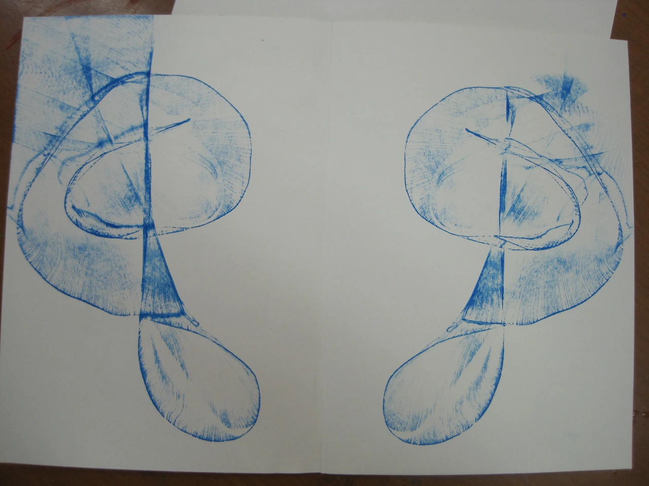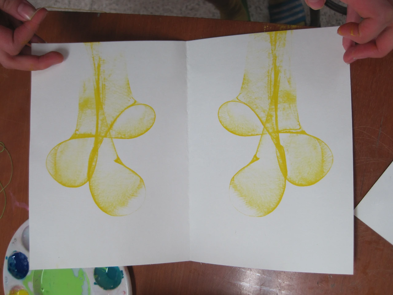 도화지를 반으로 접고 한쪽 면에 물감을 짜거나 묻힌 후 도화지를 덮는다. 손으로 누르거나 문지른 후 다시 펼치면 대칭의 그림이 생긴다. 접는 방법과 접는 위치, 누를 때 힘이 가해지는 방향에 따라 나타나는 모양이 달라진다.