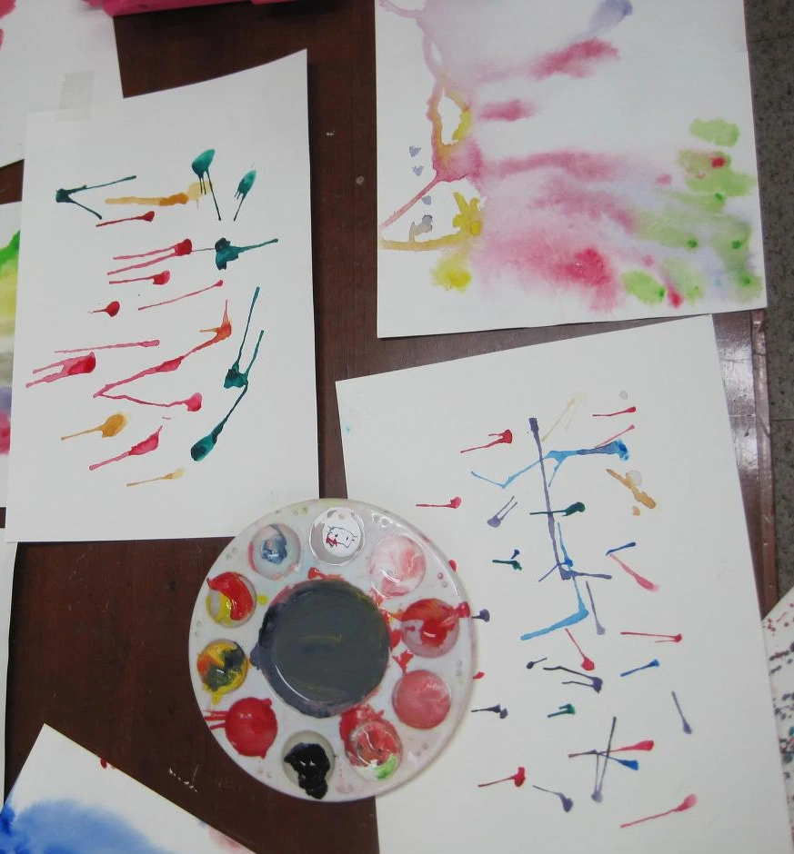 붓에 물감을 묻히고, 도화지에 뿌려 물감의 흔적을 만든다. 액션페인팅의 폴록이 주로 사용한 기법이다. 물감의 농도와 붓에 묻은 양, 뿌리는 속도에 따라 다양한 무늬가 나타난다.