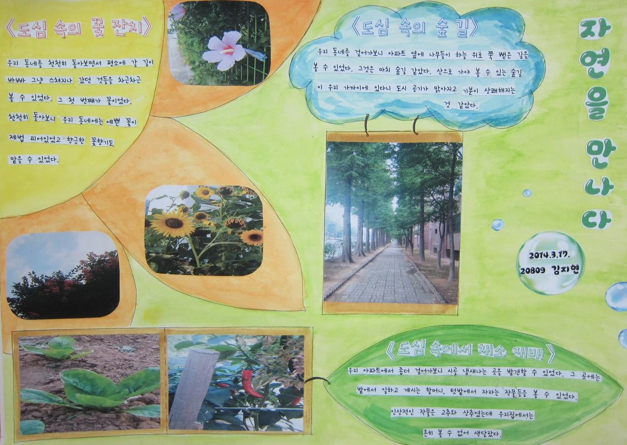 각자가 찾아낸 '우리 동네 이야기'는 사진 이미지와 국어과의 글쓰기를 통해 표현된다. 글쓰기는 그 자체로도 의미가 있으나, 미술과의 특성상 사진 이미지의 의미를 더욱 명확히 나타내 주는 보조적 역할의 의미가 강하다. 다만, 글쓰기의 경우, 지도에 한계가 있어 비문을 지도하는 정도에 머무를 수밖에 없었다.