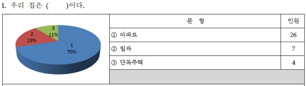 학생들의 주거환경을 알아보기 위한 문항이다. 본교는 아파트와 빌라, 다세대 주택으로 둘러싸인 주택지 안에 위치한 학교로, 주택의 종류에 따라 주변 공간의 구성이 달라지기 때문에 전반적인 상황을 알아보기 위한 문항이다.