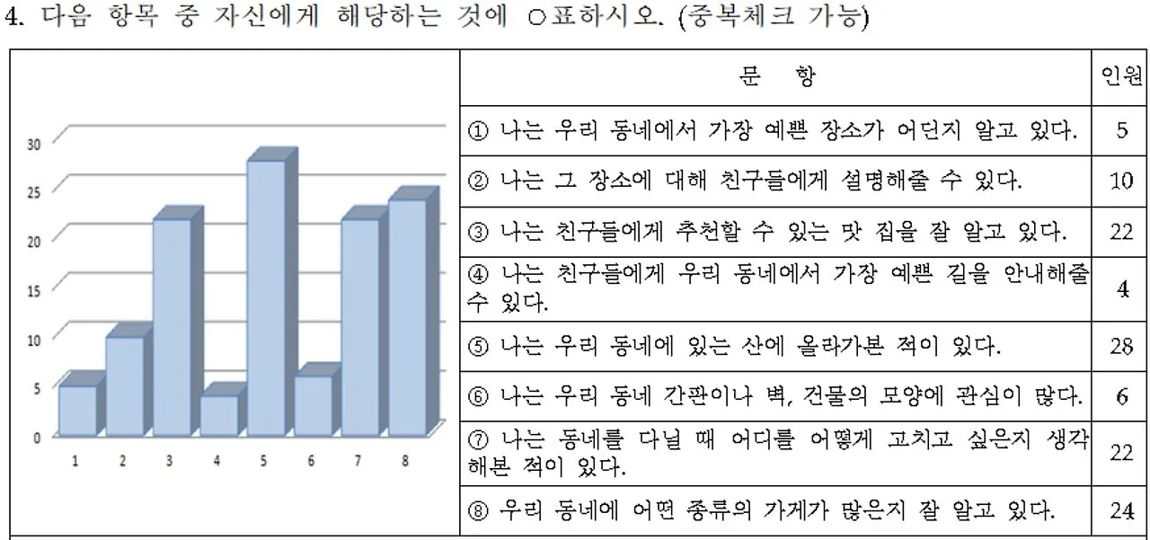내가 살고 있는 공간에 대한 인식 정도와 친밀도를 묻기 위한 문항이다. 학생들은 공간에 대한 관심이 그다지 크지 않았다. 아마도 학교와 집, 학원 이외의 공간을 이용한 일이 별로 없었을 것이다.