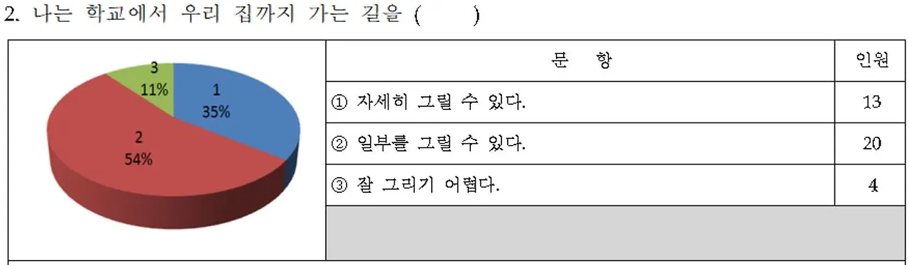 한 예로, 학생들은 학교와 집을 오가는 과정을 묻는 문항에서, 경로를 자세히 그릴 수 있는 학생들은 13명에 불과하였다. 공간을 시각적으로 표현할 수 있다는 것은 공간에 대한 의미 있는 경험이 있음을 뜻한다. 하지만, 설문 결과로 볼 때 학생들에게 공간은 일상적으로 스쳐 지나가는 장소일 뿐 스스로에게 의미 있는 삶의 터전으로서의 공간은 아닌 것으로 보인다. 이와 같은 경향은 다른 문항에서도 찾을 수 있다. 학생들이 공간의 의미를 찾아가는 것은 사람들 간의 관계를 회복한다는 의미이자 일상으로부터 특별한 의미를 찾을 수 있는 민감성의 획득을 뜻한다. 따라서 다양한 매체를 활용하여 의미를 찾아가는 과정 중심의 수업이 필요함을 확인할 수 있었다.
