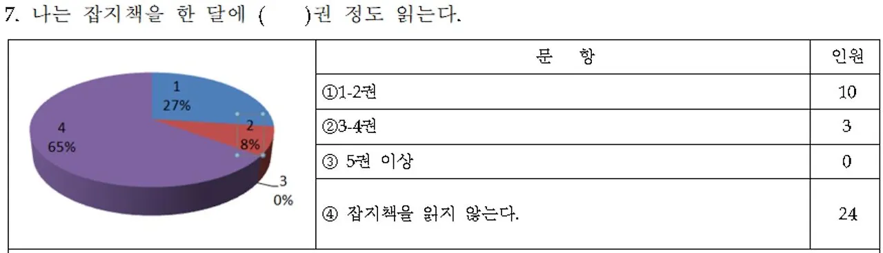잡지책에 대한 노출도와 관심을 알아보기 위한 질문이다. 학생들은 주로 1-2권을 읽고 있었다. 하지만, 잡지책의 종류에 대해 파악하지 않았다는 질문의 한계가 있었음을 인정해야 했다.