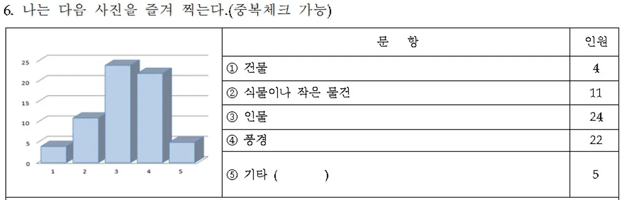 학생들의 카메라 활용과 관심을 알아보기 위한 문항이다. 학생들은 주로 풍경과 인물을 찍기 위해 카메라를 사용하고 있으며, 이는 평소 셀프 카메라나 친구들의 모습을 찍거나 주변 경치를 찍는 용도로 사용함을 의미한다.