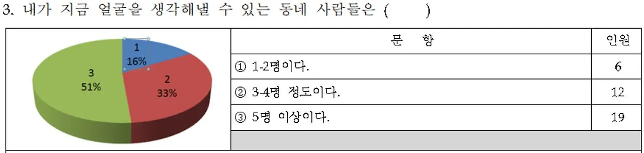지역사회의 관계에 대해 묻는 문항이다. 이 문항을 넣었을 때 내가 가졌던 생각과 달리 학생들은 의외로 많은 사회적 관계를 형성하고 있음을 알 수 있었다. 하지만, 이 문항은 어떤 사람과 관계를 맺고 있는지에 대해 알 수 없다는 한계를 가지고 있다. 질문이 피상적이었음을 인정할 수밖에 없었다.
