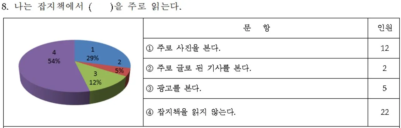잡지의 어떤 기사에 대해 주목하는지에 대해 묻는 문항이다. 7번 문항과 맞지 않는 응답이 일부 있는데, 그럼에도 불구하고 학생들은 글로 된 기사보다는 이미지 중심의 사진기사에 집중하고 있음을 알 수 있다. 영상과 이미지에 익숙한 학생들의 경향을 재확인시켜주는 설문 결과이다.