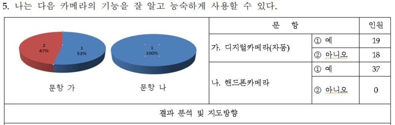 본 수업은 사진과 글쓰기가 중요한 수업으로, 사진기에 대한 평소 활용도를 묻기 위한 질문이다. 디지털카메라보다는 핸드폰 카메라가 더 친숙한 학생들의 현재 상태를 다시 한번 확인할 수 있었다. 사진 수업의 경우, 디지털카메라보다는 핸드폰 카메라의 활용에 중점을 두고 진행해야 할 필요성이 있다.