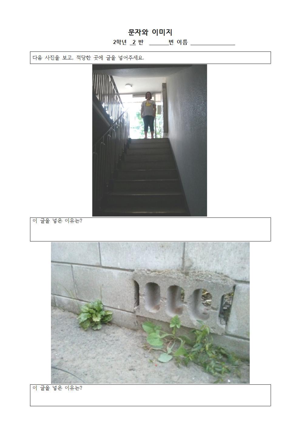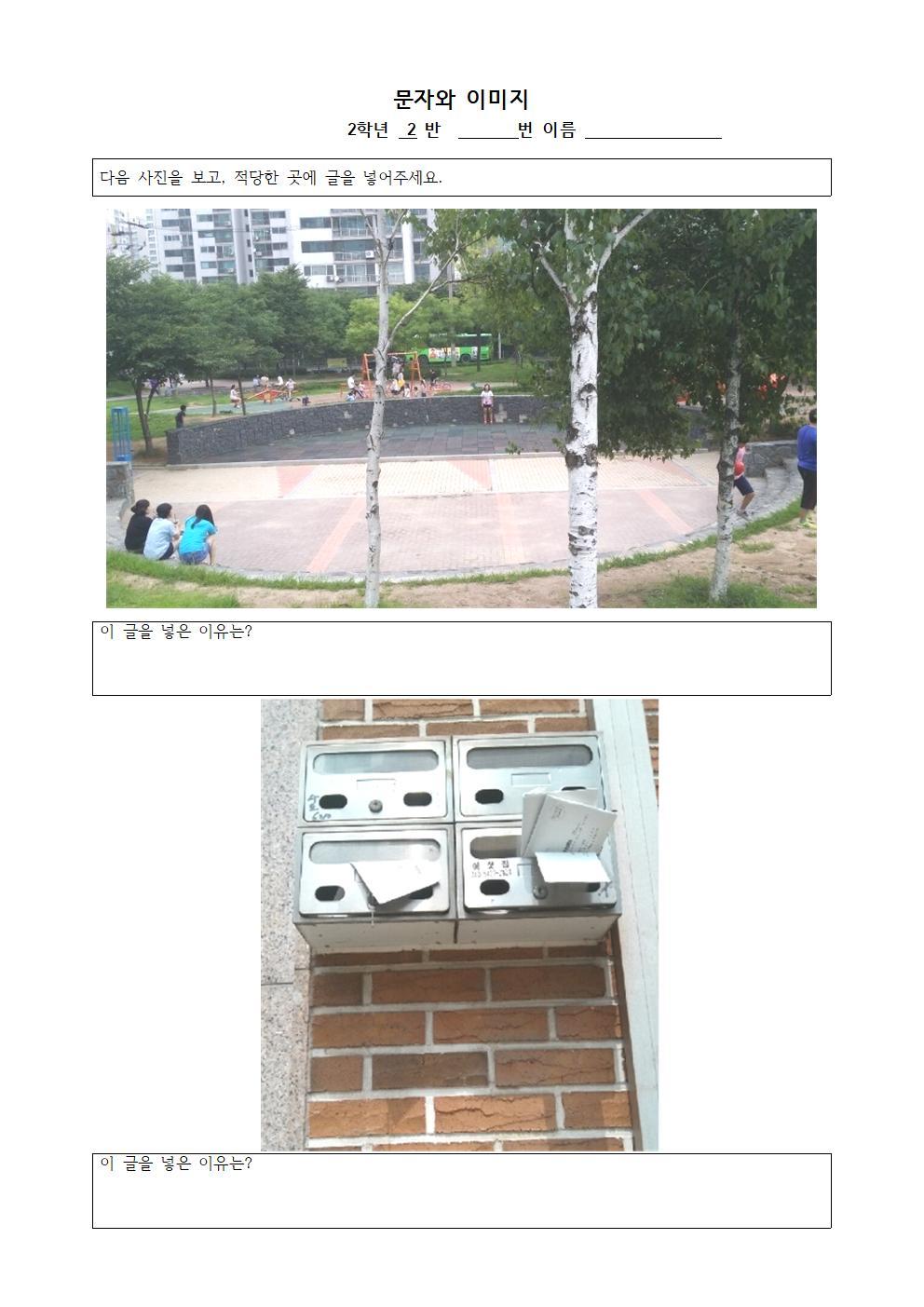 수업 전 카페에서 학생들이 제출한 이들 과제를 확인한 후 다운로드하고, 이들을 이용하여 두 장의 학습지를 만들어 놓았다. 한 장은 이미지와 문자의 관계를 알기 위해, 또 한 장은 이미지를 분류하여 스토리텔링을 하는 수업에 사용할 학습지다. 주의할 일은 이 학습지는 각 학급마다 다르게 제작이 되어야 한다는 것이다. 예를 들어 1반 수업에 사용할 이미지 1반 학생들이 찍은 이미지 중에서 선택하고, 2반에서 사용할 이미지는 2반 학생들이 제출한 과제 중에서 선택하는 방식이다. 이와 같은 방식으로 10개 학급, 총 10장의 학습지를 준비해 놓는다.