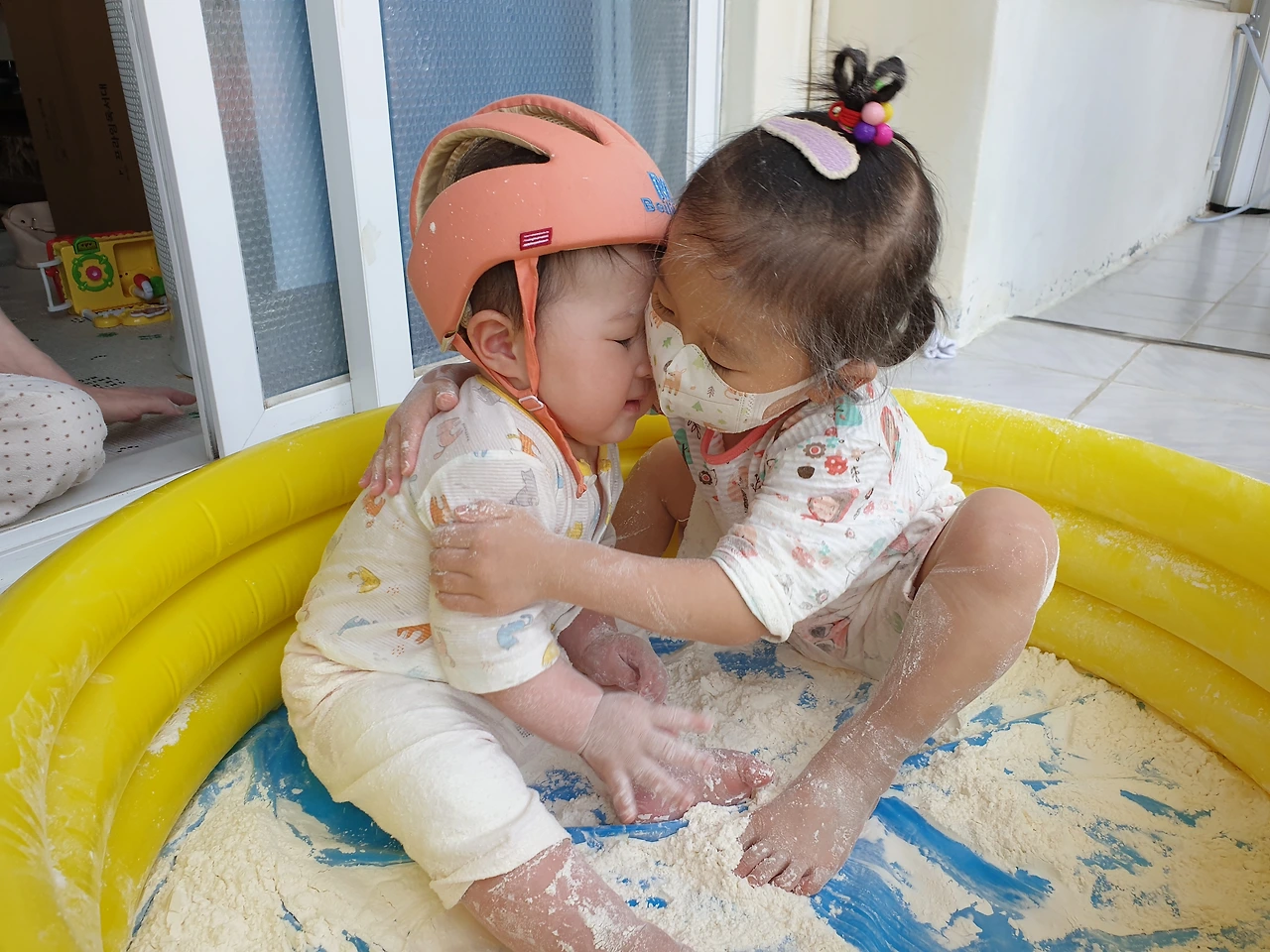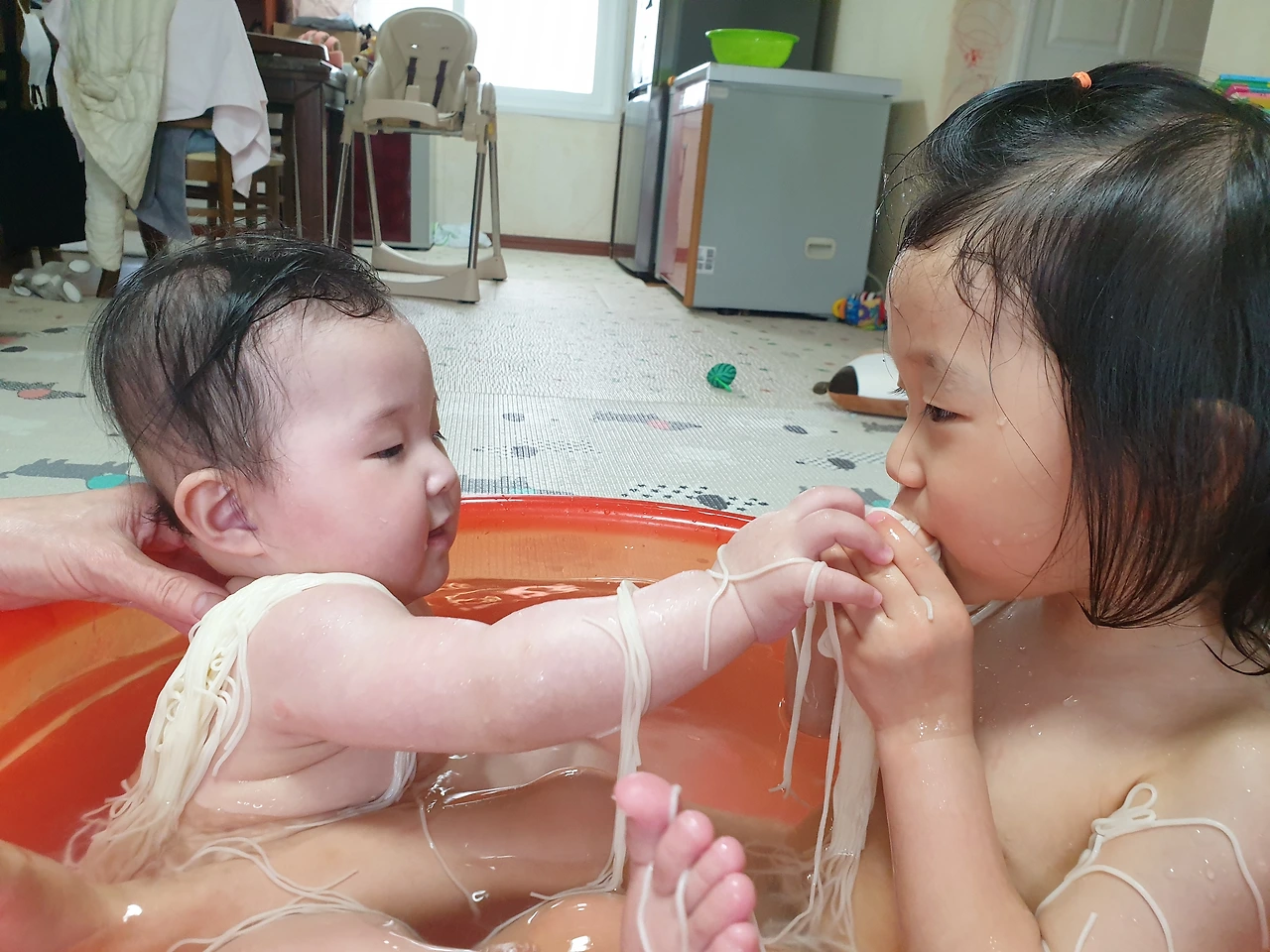 촉감놀이 중인 아이들, 사진만 보면 우애좋은 자매인줄...