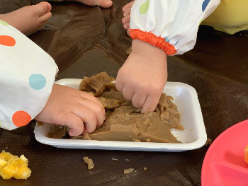 묵같은 식재료를 반은 떼어서 같이 가지고 논 다음, 챙겨뒀던 나머지 반으로 요리해서 먹어요. 놀면서 먹고, 자기들이 가지고 놀던 재료가 먹을 게 된 걸 신기해하면서 또 먹어요.