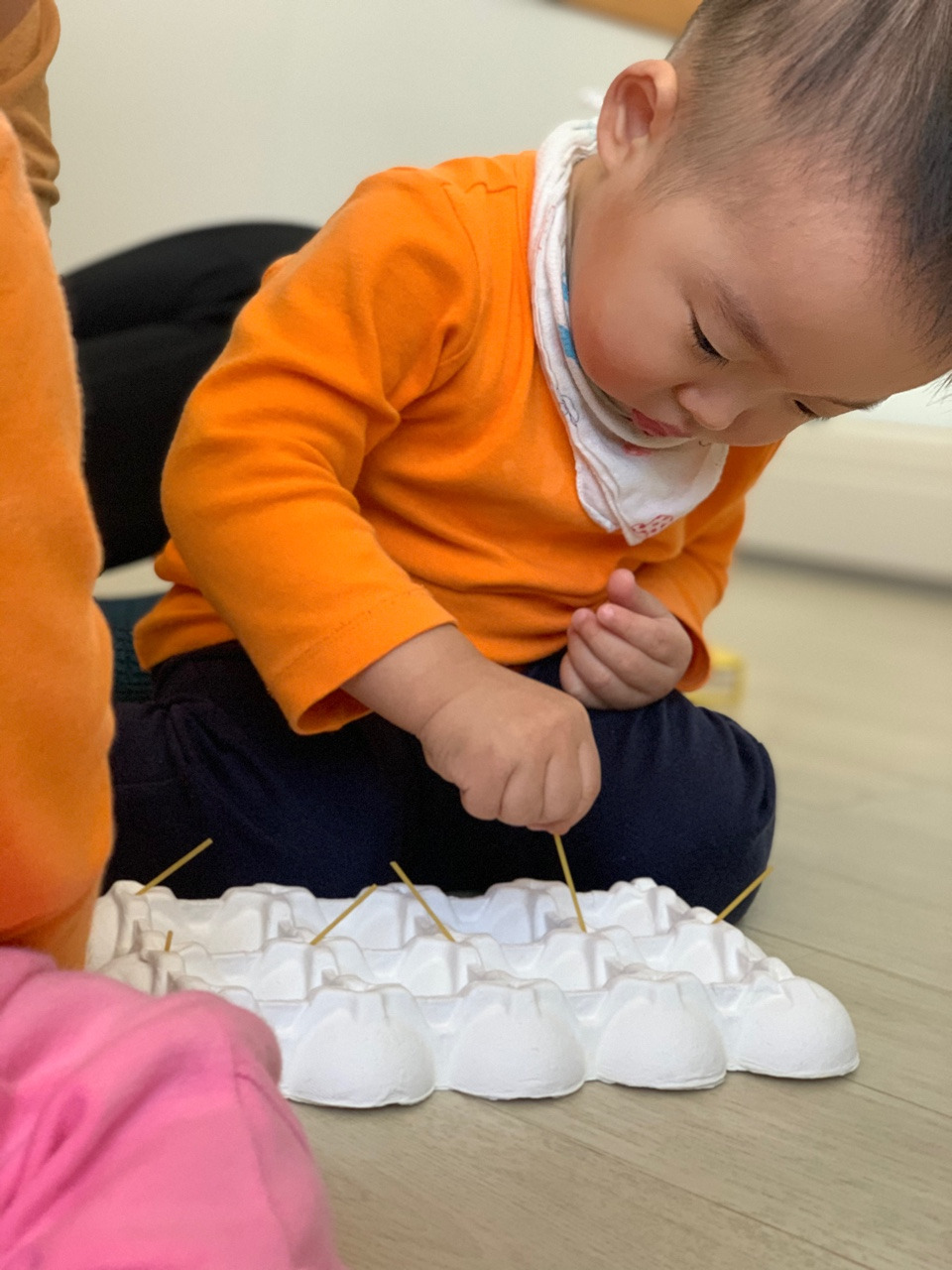 구멍 난 목욕바구니와 아이들 빨대컵의 빨대 주면 꽂기 놀이 딱이에요. 그걸 잘하길래 달걀판에 송곳으로 구멍 내서 스파게티 면과 함께 줬어요. 그것도 시간이 지나니 곧잘 하더라고요. 조만간 화장품이나 미용도구, 조리도구에 도전해보려고요.