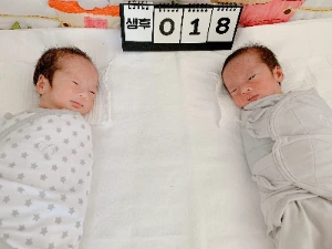 저희 아이들은 2kg 초중반대로 태어났어요. 다행히 자가호흡을 해서 신생아 집중치료실(NICU)을 거치지 않고 바로 신생아실로 향했답니다. 그래도 단태아에 비해서 작고 약할 수밖에 없었죠. 조리원 2주 보내고 집에 왔을 때, 이웃이 나눔 해주신 쁘띠라뺑 아기침대에 나란히 눕혔더니 다행히 충분했습니다.