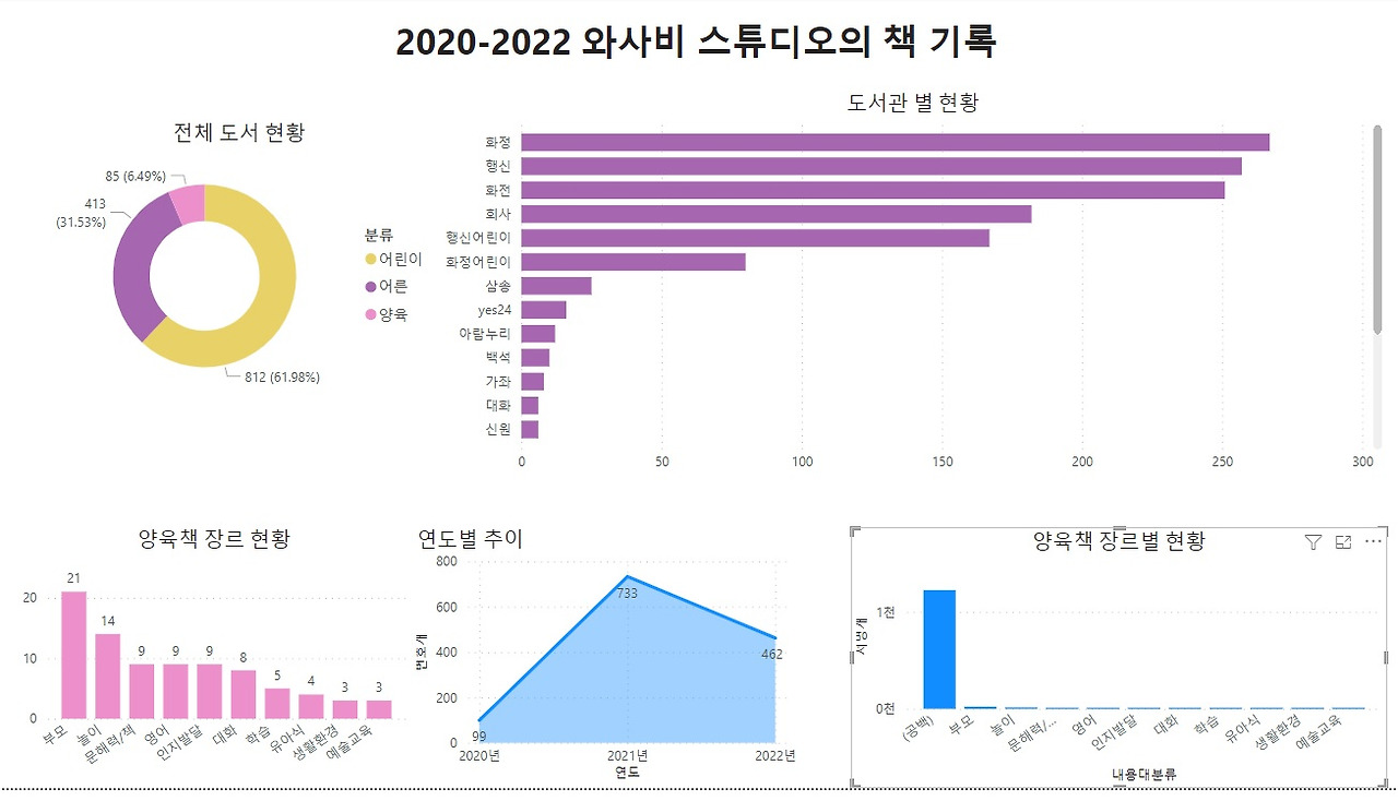 다섯 편에 걸쳐 세 돌을 돌아봤는데요. 그간 제가 책 리뷰를 올렸던 걸 기억하신 한 분이 '(육아) 책은 무엇을 읽었는지' 정리해달라셔서 지난 3년의 책 기록을 추려봤습니다. 도서관 대출 자료와 주로 책을 사는 YES24/교보문고 주문내역을 엑셀에 그러모으고 Power BI라는 걸로 시각화해보니 아래와 같네요. (*참고 : 빈도가 중요하다고 생각해서 중복제거는 하지 않았어요. 마침 Power BI 회사 연수를 듣게 되어 실습 삼아 데이터를 돌려봤어요!)
