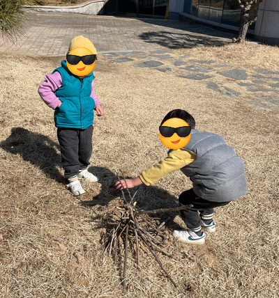 첫 두 달에 Play along은 후다닥 스킵하고 파랑이(1~3)와 초록이(4~6) Straight Play에 집중했다면, 이번 두 달은 초록이를 좀 더 보고 일상에서 활용했어요. 야외에 나가면 그렇게 나무를 줍고(pick them up), 가지고 오고(bring them back), 쌓아(pile them up)요. 태우지는(burn them up) 못하게 설득합니다.