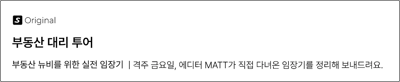 우당탕탕 직장인 부동산 투자 이야기로 '투자를 슬기롭게' 도와주는 썸렛 팀과 함께 뉴스레터를 쓰고 있어요. 매주 월/목/금, 다양한 투자 이야기를 '써머리'해드리고 있으니, '월급 만으로 현생 답 없는', '슬기로운 투자'에 관심있는 분들이라면 꼭 구독해보시길 바래요.