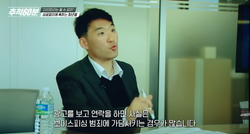 최근 방영된 <추적60분> 에서는 몇 개월 전 대한민국을 뒤집어 놓았던 캄보디아 보이스 피싱 집단 사건을 시작으로, 유튜브, sns로 학생들만을 타깃으로 하는 피라미드구조의 성공팔이 사례, 자신도 모르게 보이스피싱 전달책이 되어 범죄자가 된 청년들의 이야기를 통해, 오늘날 청년들이 어떻게 범죄의 가장 하층부로 밀려나 피해자가 되는지를 보여준다.