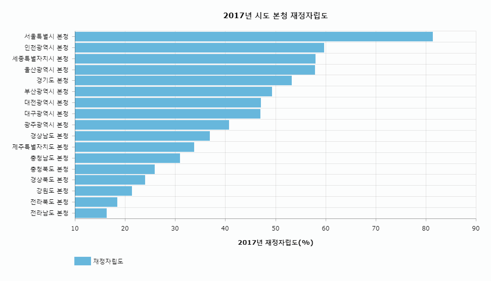 2017년 기준으로 서울, 경기를 제외하고 재정자립도가 50%를 넘는 자치단체는 10곳이 채 되지 않으며, 특별 광역시도 본청도 인천, 세종, 울산을 제외하고는 50%가 넘지 않습니다.