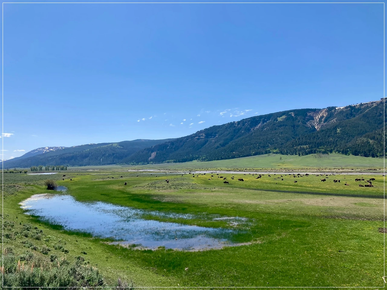 첫째 날 밤은 매머드 핫스프링 근처 화장실 없는 랏지에서 묵고 다음 날 아침 일찍 동쪽으로 길을 나섰다. 왕복 2차선 좁은 도로를 달리다 보면 한 번씩 차가 막히곤 하는데 여지없이 야생동물 때문이다. 곰, 사슴, 들소 등등. 동물이 길을 가로막고 있으면 차가 기다려주기도 하고, 때로는 사람들이 길가 동물을 보려고 길옆에 차를 무작정 세워놓기도 하여 때아닌 교통체증이 생긴다. 아무리 애써도 나는 갖기 어려운 사람들의 여유가 부럽다. 시간이 그리 촉박한 것도 아닌데 잠시도 멈춰 있지 못하는 스스로를 자책하고 있을 때쯤 어느새 다다른 곳은 라마벨리(Larmar Valley)라고 하는 초원 지대. 나는 눈을 의심하지 않을 수 없었다.
