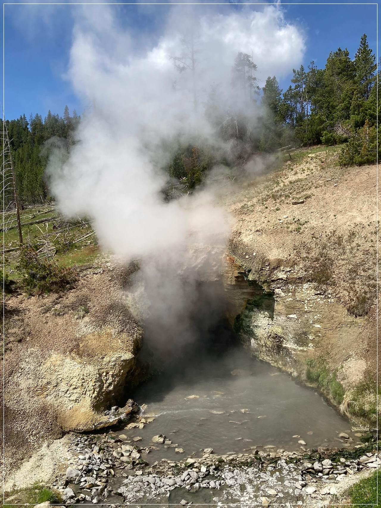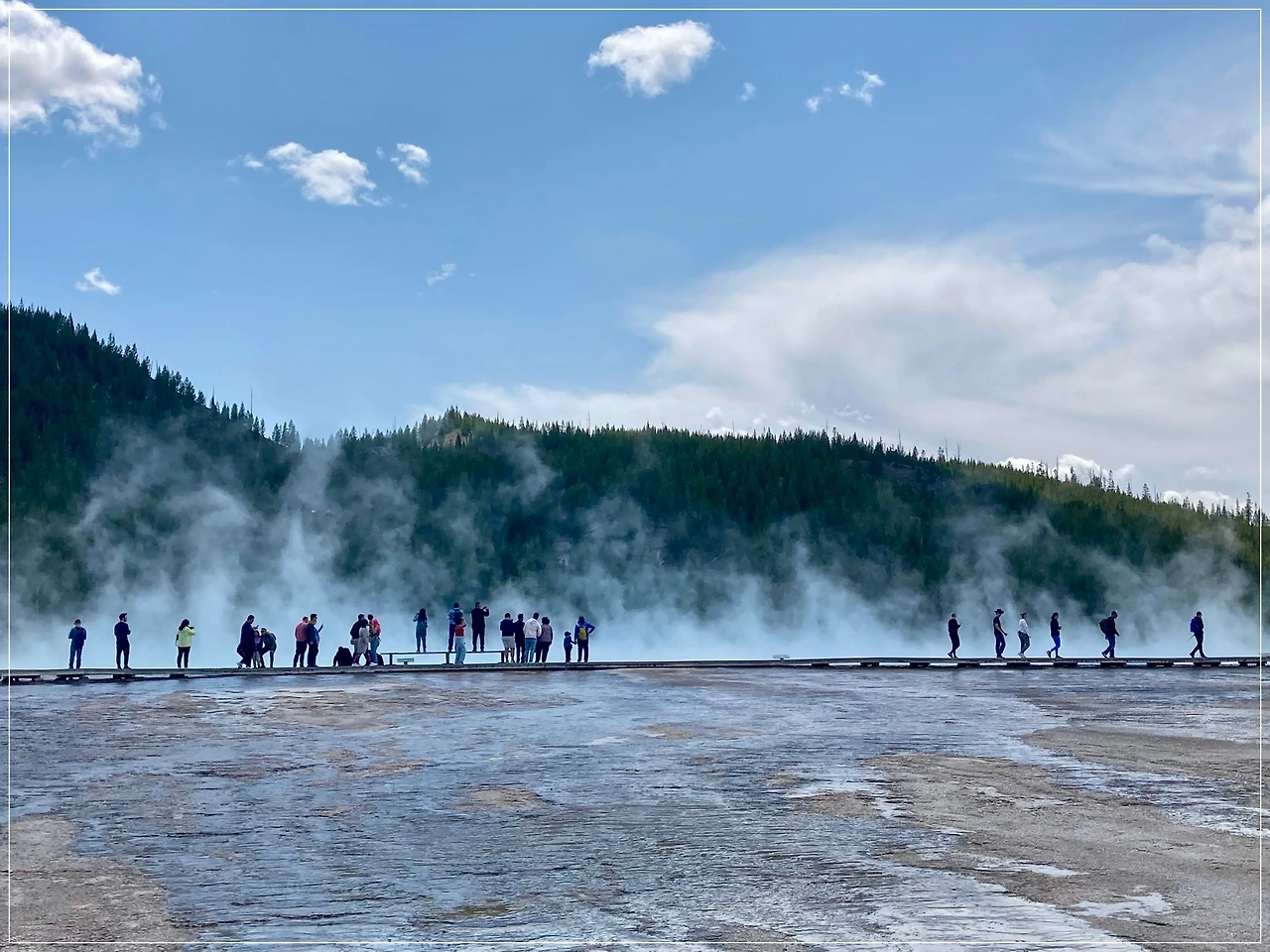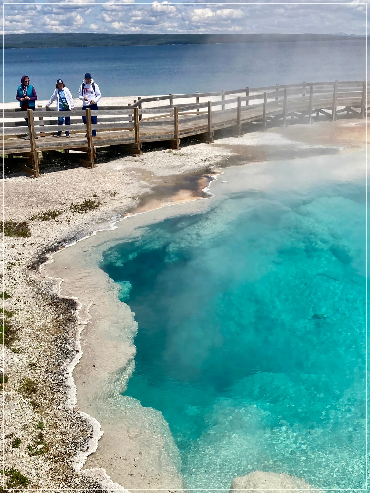 셋째 날 아침은 캐년 빌리지 숙소 근처에 있는 식당 시설을 이용하였다. 비교적 깔끔하고 음식 종류도 다양해서 오랜만에 든든히 배를 채웠다. 물론 햇반, 라면은 필수로 곁들인다. 내려가는 길에는 넓디넓은 옐로우스톤 호수가 보인다. 쾌적한 호수뷰 드라이브 끝에는 West Thumb 가이저가 있다. 이름들이 슬슬 헷갈리기 시작할 무렵 다시금 가이저가 무엇인지 되짚어본다. 지열 지대는 지하의 열이 지표에 다양한 형태로 나타나는 지대를 말한다. 대표적인 지열 지대 현상으로 핫스프링(온천)은 뜨거운 지하수가 지표로 올라오는 것, 가이저(간헐천)는 핫스프링의 일종이며 가끔씩 뜨거운 물과 증기를 분출하는 것이다. 호수를 바라보고 평화롭게 자리 잡은 가이저들은 붉으락 푸르락 황홀한 빛을 발산하지만, 한 때는 지구상에서 가장 위험했던 이곳의 무참히도 뜨거웠던 과거를 상상케 한다.