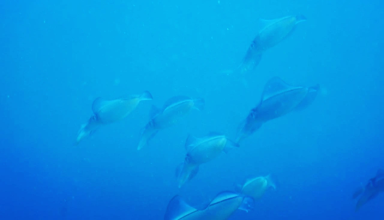 멜 떼 영상을 다 보니, 이번엔 다양한 크기의 물고기가 다 함께 뒤엉켜 있었다. 아래에서 올려다보면, 역광 때문에 물고기가 모두 검게 보이는데, 모양과 크기가 제멋대로라 우주에 있을 법한 소행성대가 떠올랐다. 나는 지금 사실 우주선에 타고 있는 게 아닐까? 내 흥분된 숨소리와 선선한 온도의 바다 감촉이 아니었다면 분명 환시(시각적 환각)를 의심했을 것이다. 그 와중에 한치 떼도 유유히 지나가는데, 영화 <트루먼 쇼>처럼, '누군가 내가 제주 바다를 사랑하게 만들려는 공작이 틀림없다'고 생각했다.