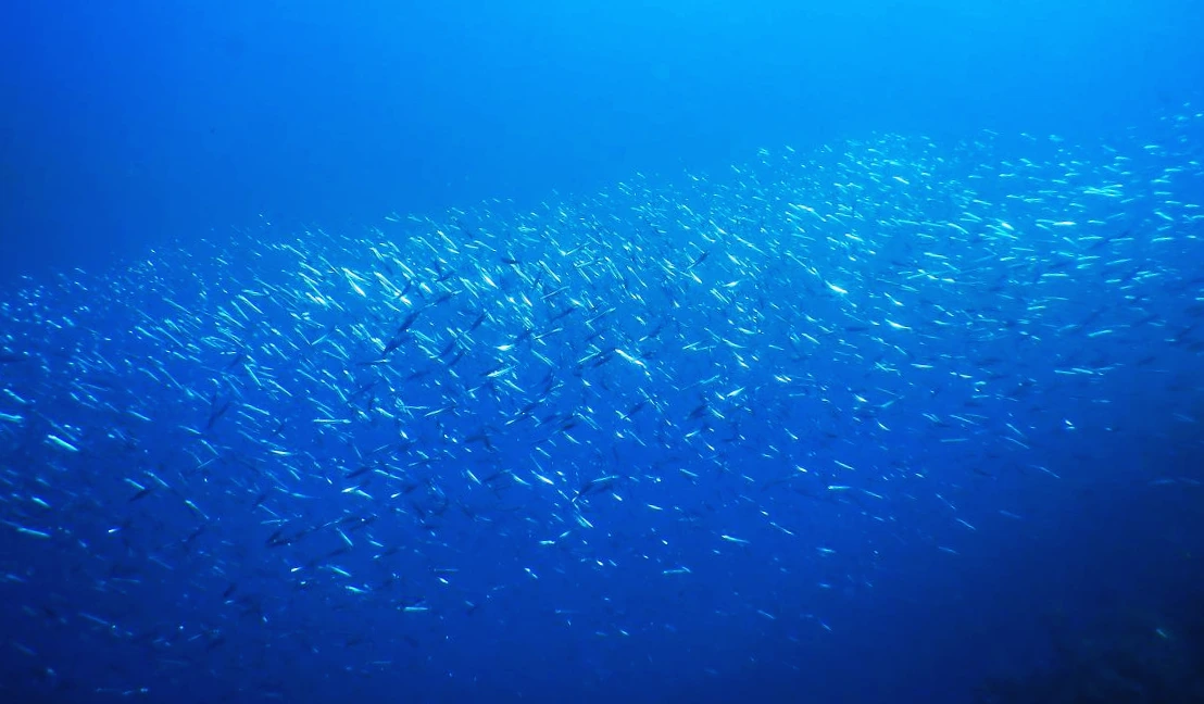 아래서 바라보면 검은 소행성/먼지처럼 보이는 물고기떼(왼쪽) 초장 땡기는 한치떼(오른쪽)