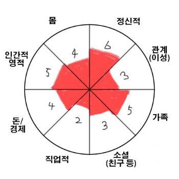 방법은 간단하다. 자신이 중요하다고 생각하는 삶의 영역을 7-10개 정도 정하고 각자에 점수를 매겨보는 것이다. 나는 몸, 감정적이고 정신적인 영역, 이성과의 관계, 가족과의 관계, 사회적 관계, 직업적 영역, 돈/경제, 인간적인 완성/영적인 부분 이렇게 8가지를 정했다. 그리고 점수를 매겨보자. 0점은 완전히 없는 상태, 10점은 완벽히 자신의 이상적인 삶을 사는 상태이다.