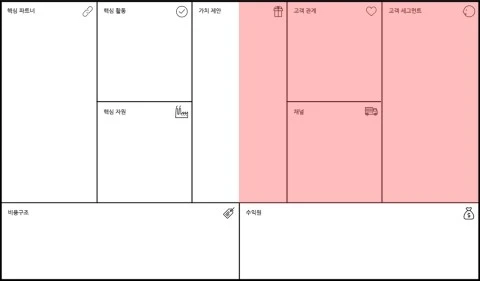 첫째는 고객 가치 부분이다. 이 부분에는 가치 제안, 고객, 채널, 고객 관계 4가지 블록이 해당하는데 이 블록들은 고객에게 어떤 가치를 어떻게 전달할 것인가에 대한 대답이 된다.