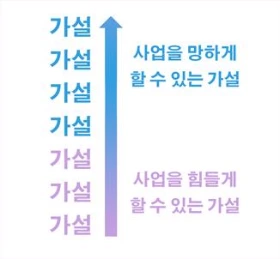 가설들의 리스트를 만든 후에는 우선순위를 정해야 한다. 사업에 있어서 중요한 순으로 정리해야 한다. 가장 먼저 검증해야 하는 것은 확인하지 않는다면 사업을 망하게 할 수 있는 요소들이다. 예를 들어 신사업이나 스타트업의 경우에는 고객이 무엇을 원하는지에 관한 가설이 가장 먼저 검증되어야만 한다. 아무도 원하지 않는 것을 만들어서 사업을 할 수는 없다.(기존의 비즈니스를 혁신하는 경우에는 가장 중요한 것이 다른 것일 수도 있다.) 그 후에 제품이나 서비스 등의 가치 제안부터 나머지 다른 영역을 검증해 나가야 한다.