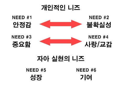 여기까지 네 가지 니즈는 사람이라면 누구나 추구해야만 하는 니즈이다. 안정과 다양성, 중요성, 사랑 이렇게 네 가지 니즈는 살아가는데 반드시 필요하다. 정도의 차이는 있겠지만 누구든지 이 니즈들은 반드시 어느 정도는 충족시키려고 한다. 나머지 두 가지 니즈는 우리가 삶의 충족감을 느끼기 위해서, 자아실현을 위해서 필요한 니즈이다.