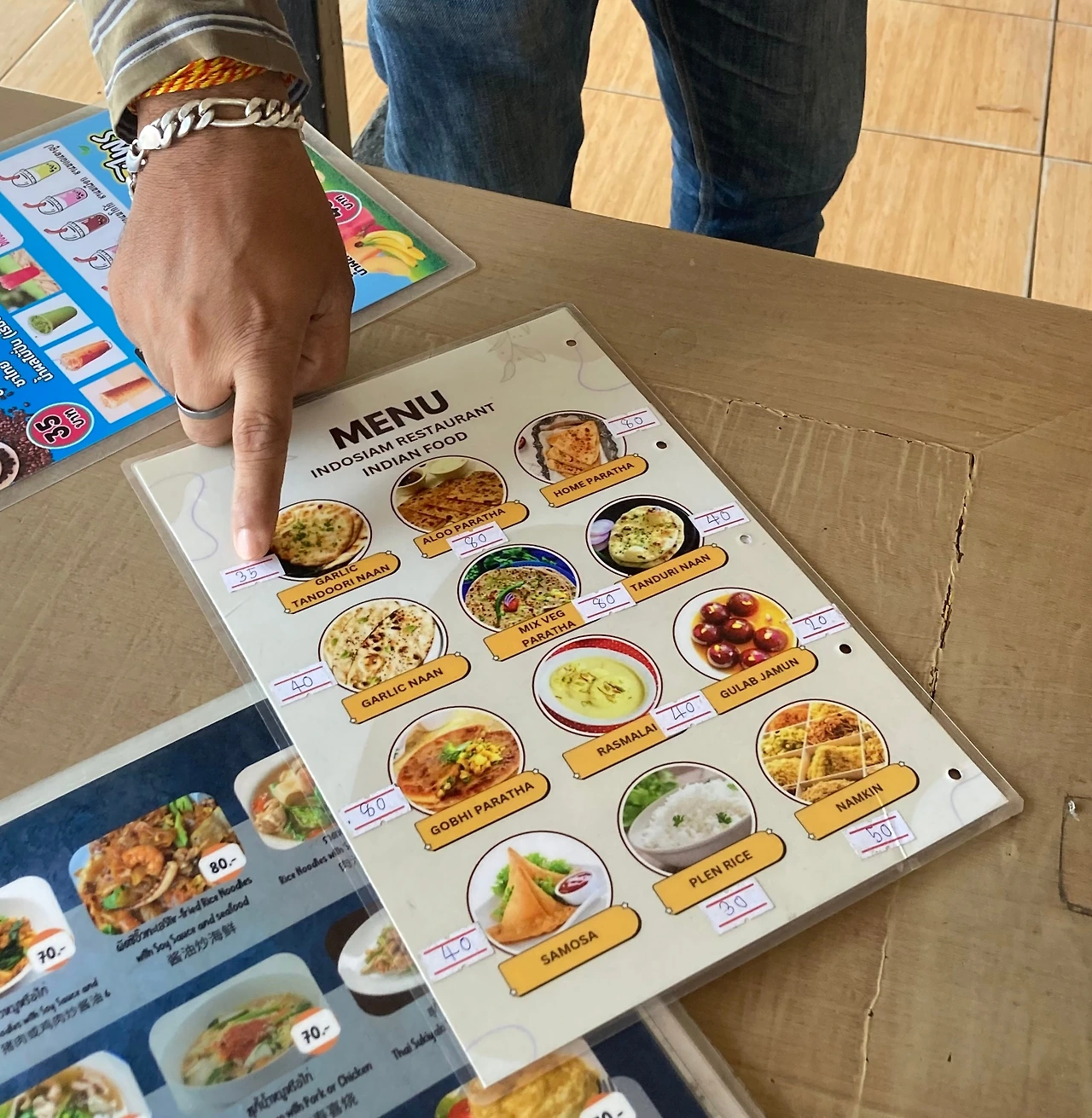 돌아와서, 아침을 먹으러 밖으로 나갔다. 총이가 검색한 숙소 바로 앞 로컬 식당에 갔더니, 열지 않았다. 다른 식당을 찾아가는 길에, 덥기도 해서 외국인 한 명이 앉아 있는 식당을 발견하고 그냥 여기서 먹자고 들어갔다. 주인이 거의 영어를 하지 못한다. 메뉴판에 있는 사진과 영문을 보고, 오징어와 새우가 들어간 해산물을 달라 했더니 오징어와 새우가 없단다. 그래서 돼지고기가 들어간 오믈렛을 시켰는데, 내가 상상하던 오믈렛은 아니었다. 관광지이지만 그래도 현지 식당을 찾아 들어가면 평범한, 태국 식사가 60에서 80밧 정도 되는 것 같다. 요즘 환율로 2,500원에서 3,500원 정도.