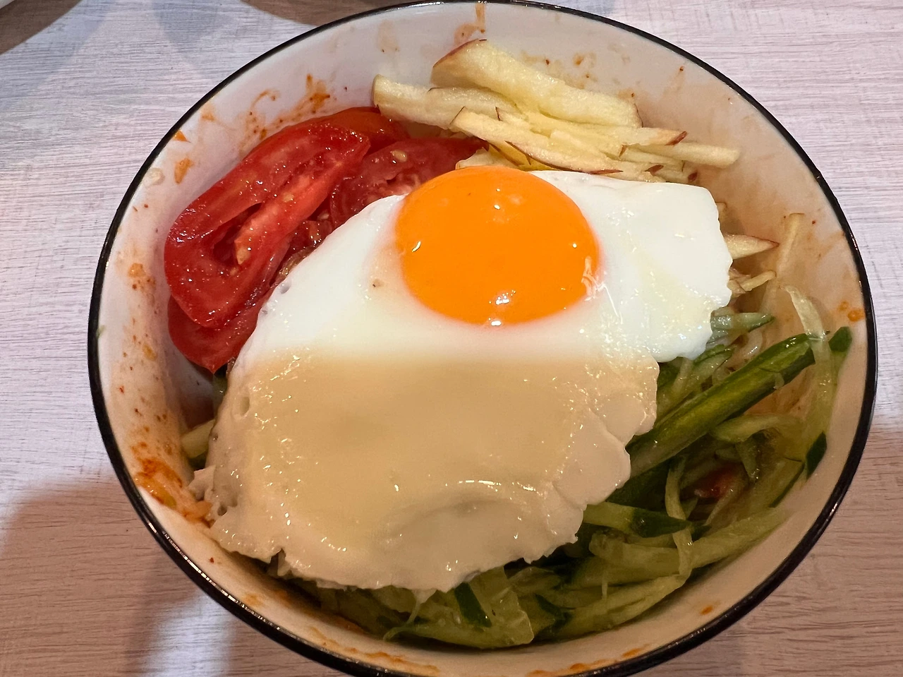 잠깐 쉰 후에 저녁으로는 한국에서 싸 온 비빔장과 마크로에서 산 사리면 두 개로 비빔면을 해 먹었다. 오이와 토마토 사과를 채 썰어 넣고, 계란 프라이를 얹어 풍성하게 먹었다. 사 온 땅콩은 생땅콩이어서 프라이팬에 볶아야 했다.