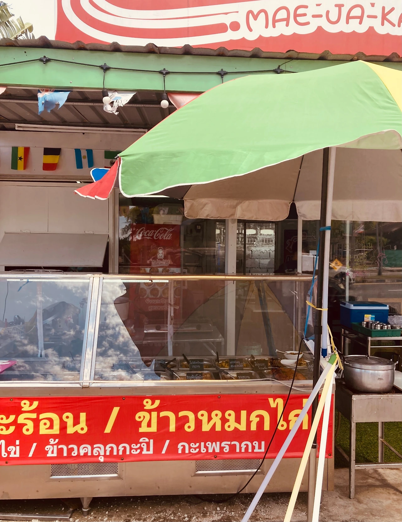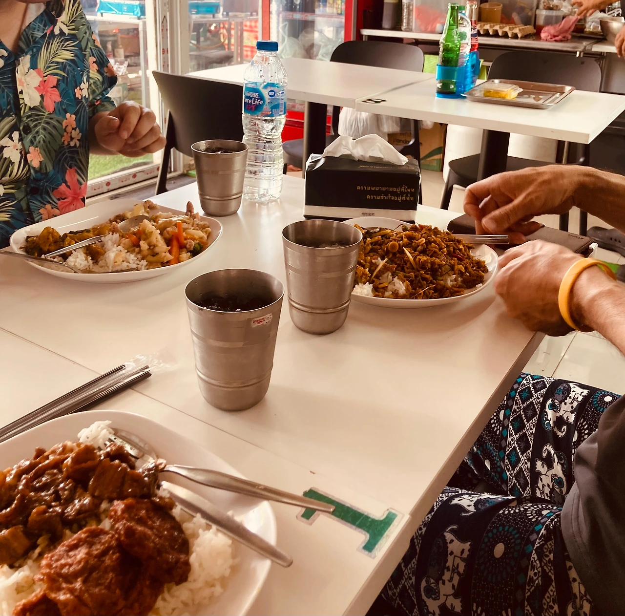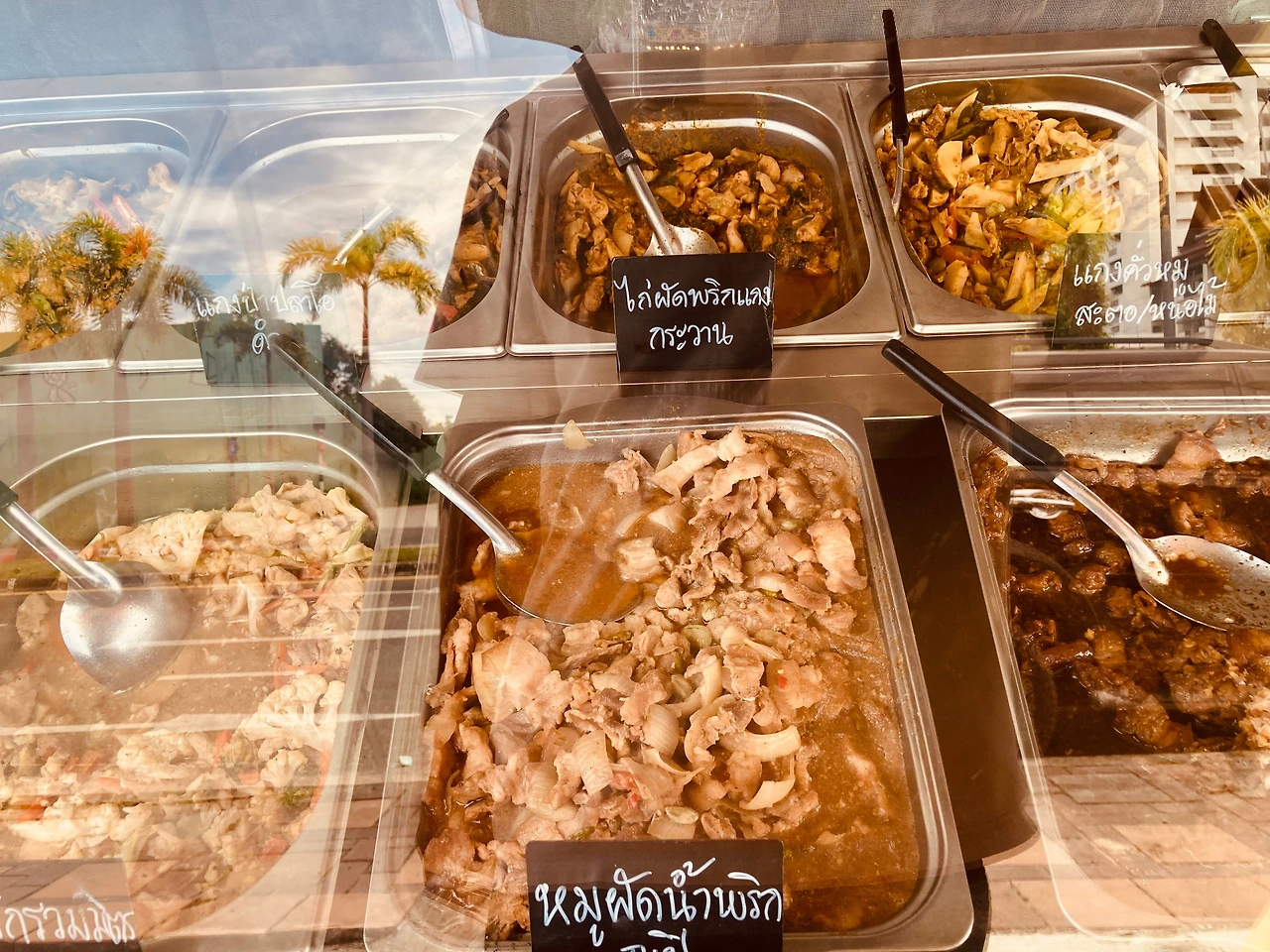 총이는 현지인과 대화하기를 즐기고, 물어보는데 거침이 없다. 총이 덕분에, 그렇게 점심 저녁 식당 후보를 만났다. 점심은 두 가지 반찬을 선택해서 먹는 60밧짜리 현지 식당이었다. 주인아저씨가 서비스로 소고기 뭇국 같은 국도 주시고, 채소도 샐러드로 선택하게 해 주셨다. 작은 수통처럼 생긴 플라스틱 통에 설탕이 들어간 커피를 내려 팔았는데 20밧이었다. 나는 매울 거라고 했던 돼지고기 볶음을 먹었는데, 생강과 고추가 많고 엄청 매워서 다 먹지 못했다. 태국 남부 지방인 팟타이 지방 전통 요리라는 설명 같았다.