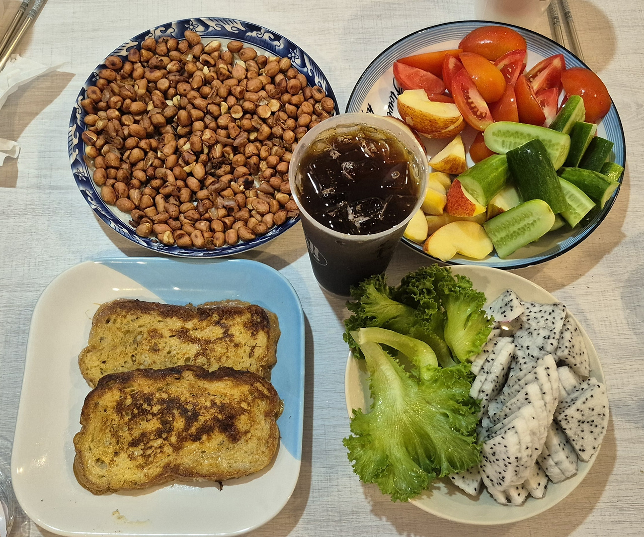 어제 마크로에서 산 재료로 아침을 준비했다. 쌈 채소, 토마토, 오이에 식초를 뿌리고, 용과와 사과, 볶은 땅콩, 그리고 버터에 프렌치토스트를 구웠다. 세븐일레븐에서 아이스 아메리카노와 뜨거운 아메리카노를 한 잔씩 준비했다.
