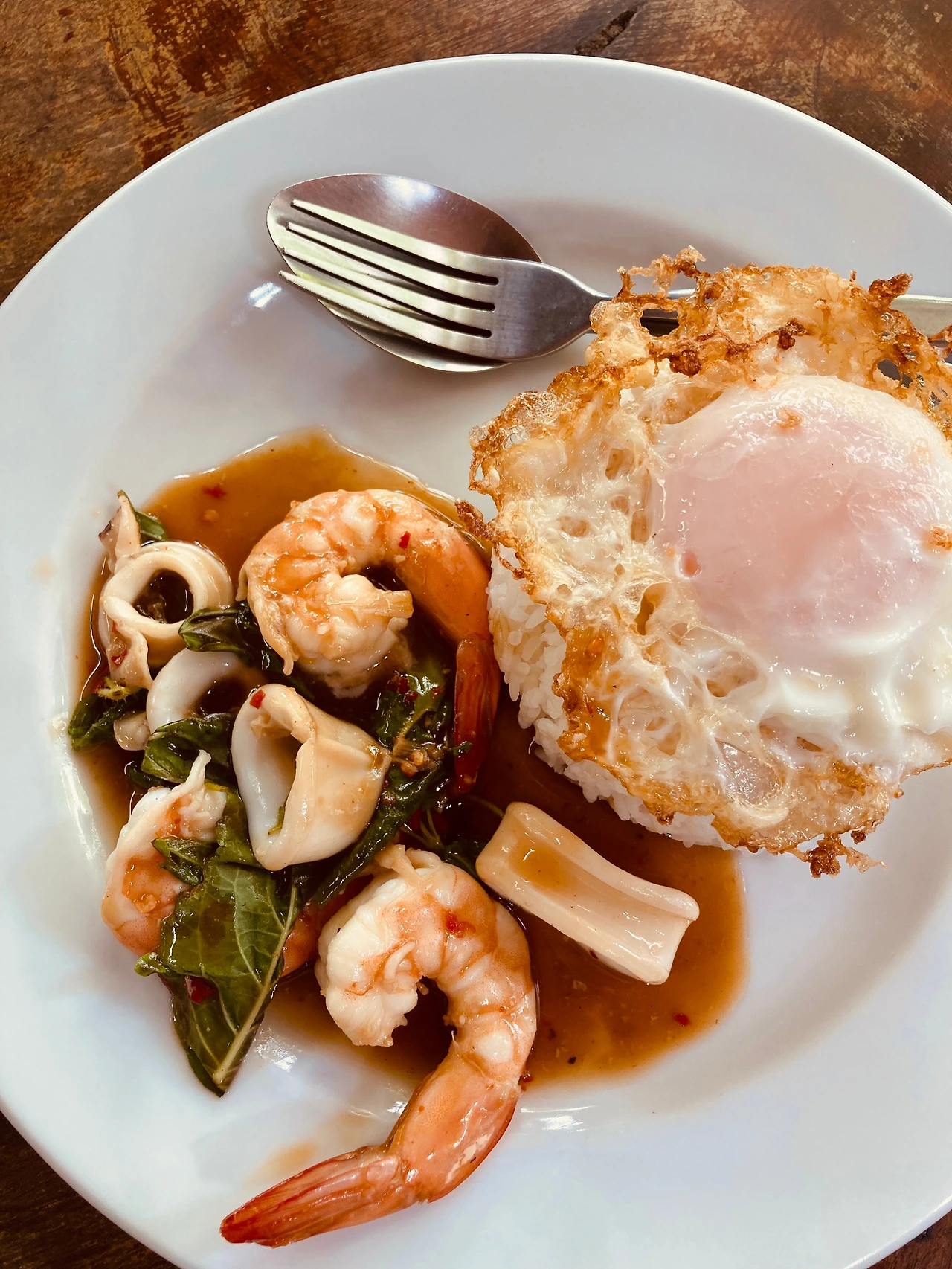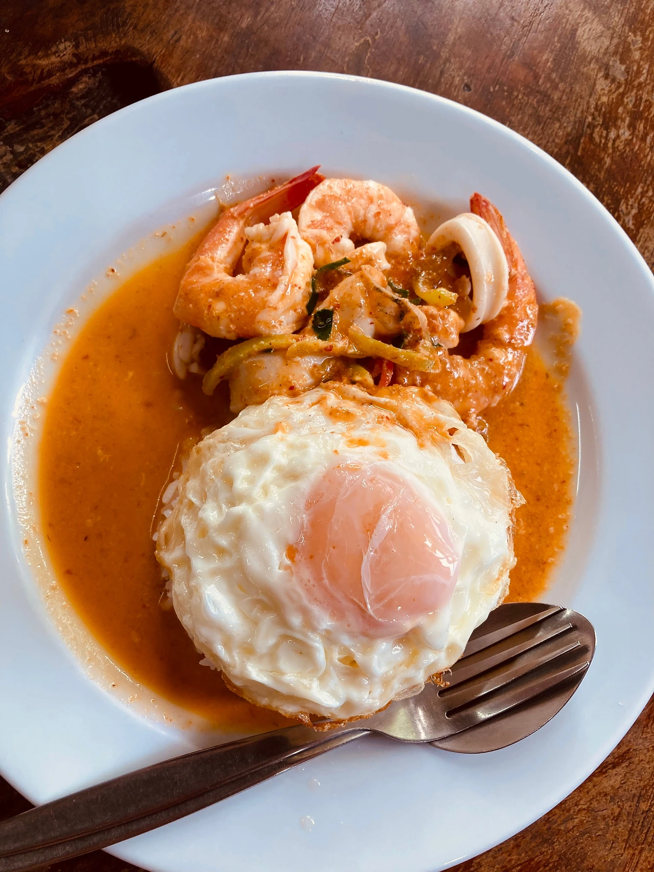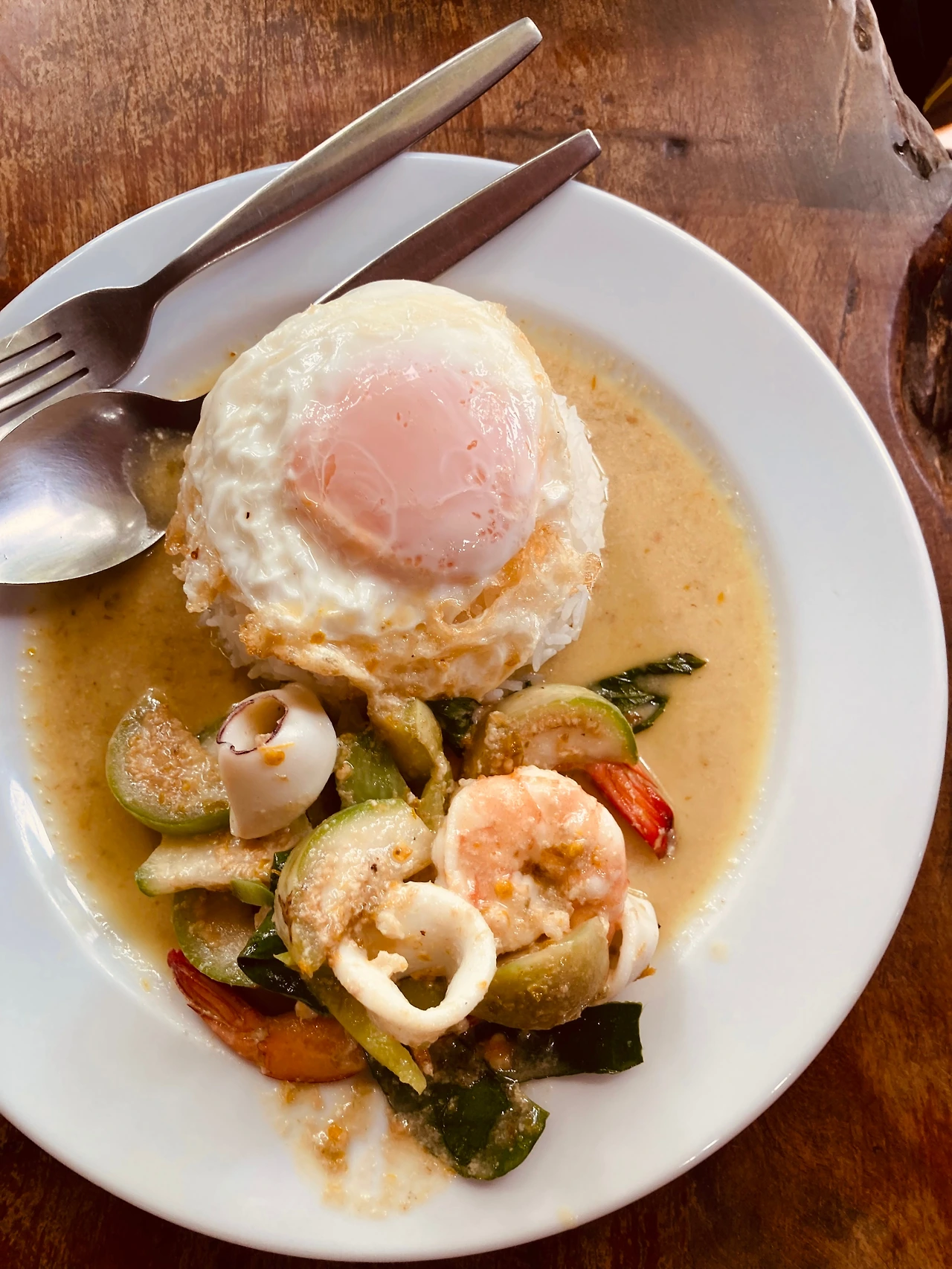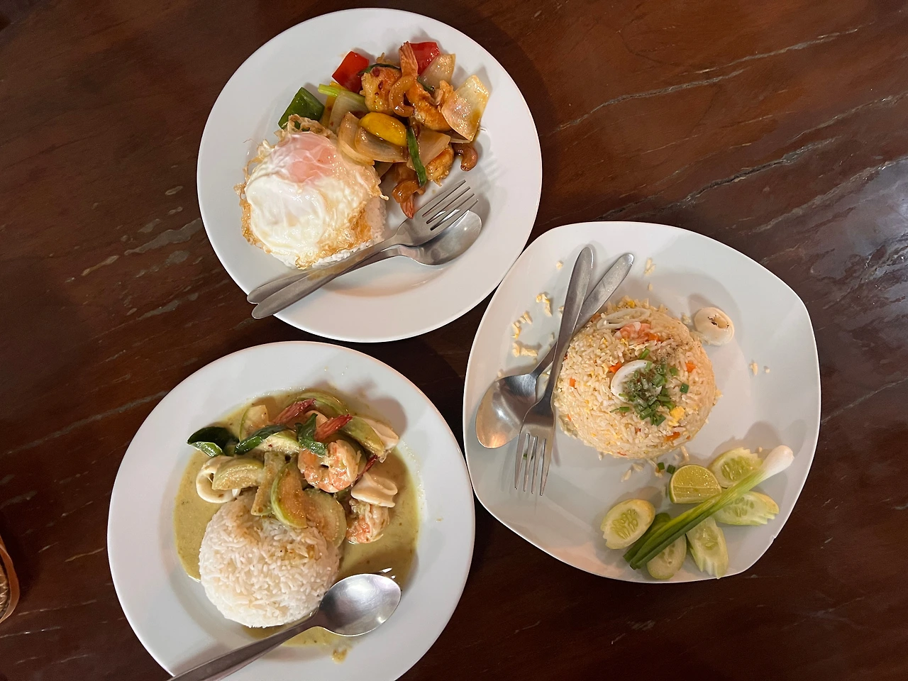 총은 해산물 그린커리, 용관은 해산물 레드커리, 나는 해산물 볶음밥을, 모두 10밧 계란 프라이를 추가해서 시켰다. 공깃밥 양은 좀 많고, 주재료는 살짝 적은 듯싶었지만 깔끔하고 맛이 괜찮았다. 총 240밧 나왔다. 저녁도 이곳에서 총과 용관은 돼지고기 볶음밥을, 나는 그린 커리를 역시 10밧 계란 프라이를 추가하여 시켰다. 210밧이었다. 이곳이 우리의 숙소 앞 단골집이 될 것 같다.