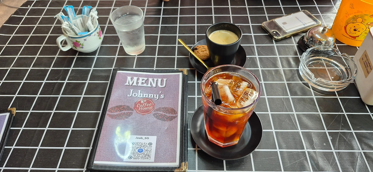 돌아오는 길에, 커피가 맛있다는 구글맵 평이 있었던 Johnny's 커피하우스에 들러서 커피를 시켰다. 근처 대학에 다니는 딸내미가 한국을 무척 좋아한다는 주인아주머니는 매우 친절하셨다. 뜨거운 커피는 50밧, 아이스 아메리카노는 60밧이었는데 사실 맛은 세븐일레븐 커피와 별로 다르지 않았다. 아마도 에스프레소 전용 머신이 아니라, 한국 음식점에 많이 있는 볶은 커피콩을 넣어 두면 자동으로 분쇄해서 원두커피를 내려 주는 그런 머신 쓰는 것 같았다.