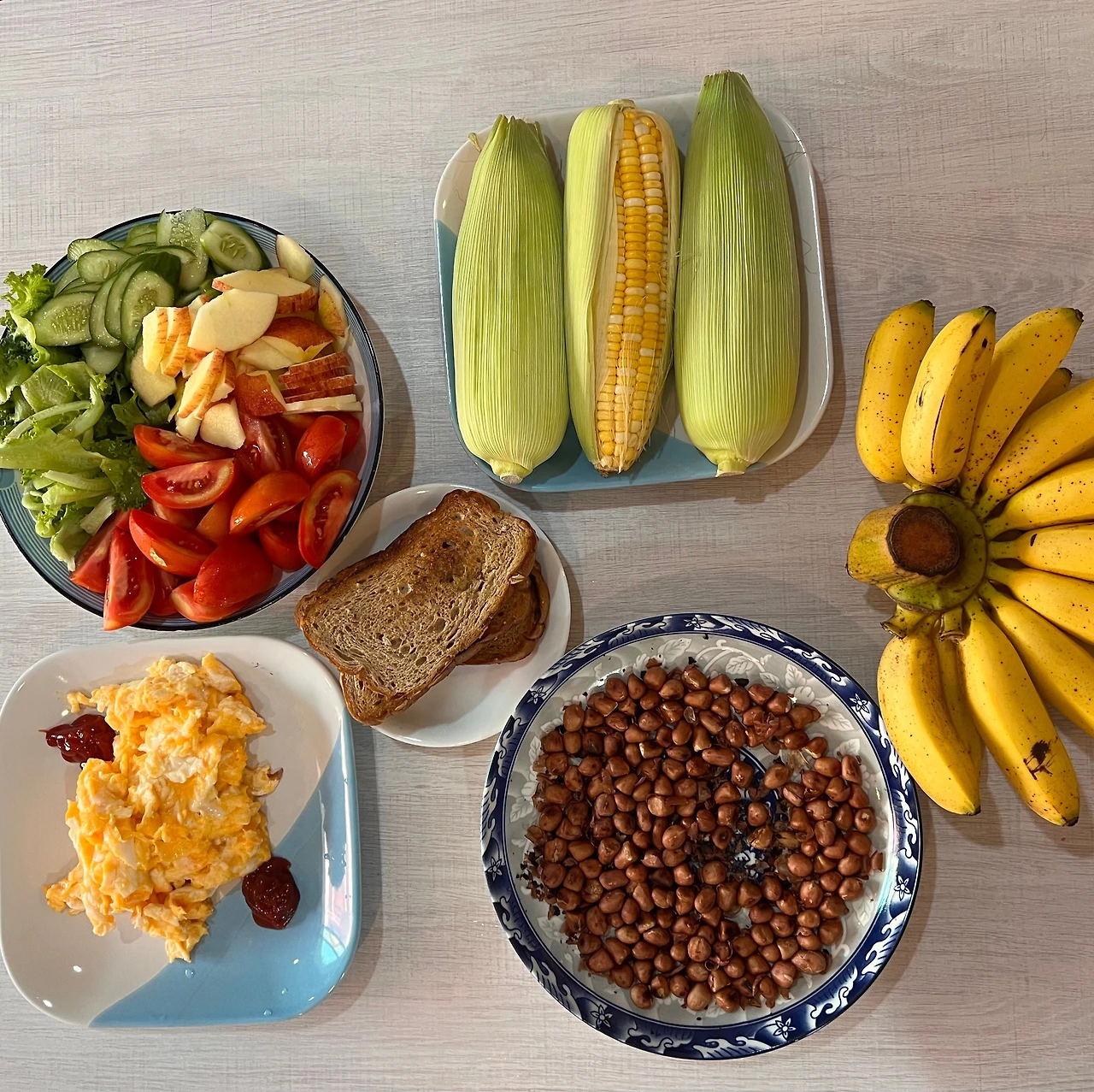 총이가 하루에 밀가루 음식은 한 번 정도만 먹자고 해서, 아침은 프렌치토스트를 제외하고 어제처럼 준비하려 했는데, 용관이 버터에 식빵을 굽자고 해서 몇 조각 추가했다. 그리고 마크로에서 사 온 옥수수 세 개를 전자레인지에 익혔다. 어쩌다 보니 아침부터 폭식을 하게 되었네.