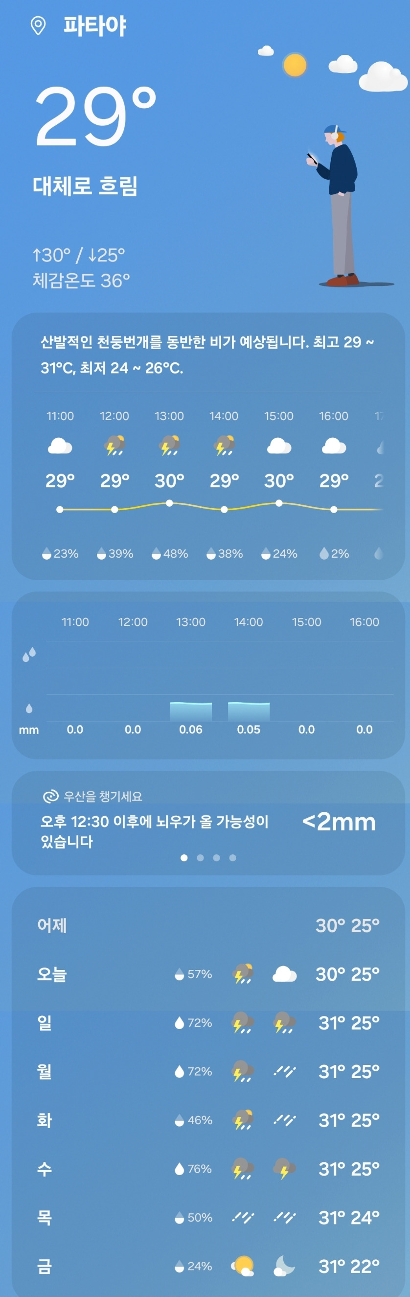 한밤중에 요란하게 천둥번개가 쳤다. 아침에 보니 수영장 물이 왠지 조금 불어난 느낌이다. 원래 11월부터 건기가 시작이라더니, 오는 날부터 하루도 쨍쨍하게 화창한 날이 없었다. 그랩 기사님이 이상하다고 했으니, 아마 일반적인 태국 날씨는 아닐 수도 있겠다.