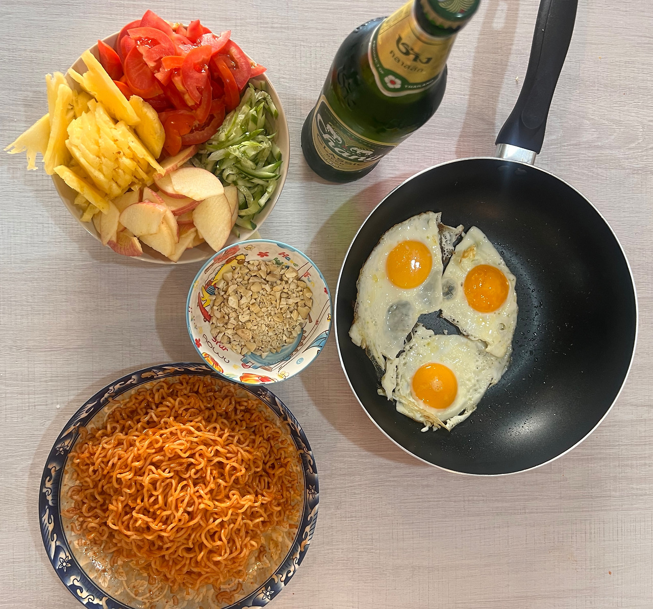 저녁은 단골식당인 Jaena Pad Thai에서 난 레드 커리, 용관은 해산물 볶음라면, 총은 튀긴 생선밥을 220밧에 먹었다. 어제 사온 홍통이란 양주에 제로 스프라이트로 하이볼을 만들어 에그타르트와 견과류를 안주 삼아 마셨다.