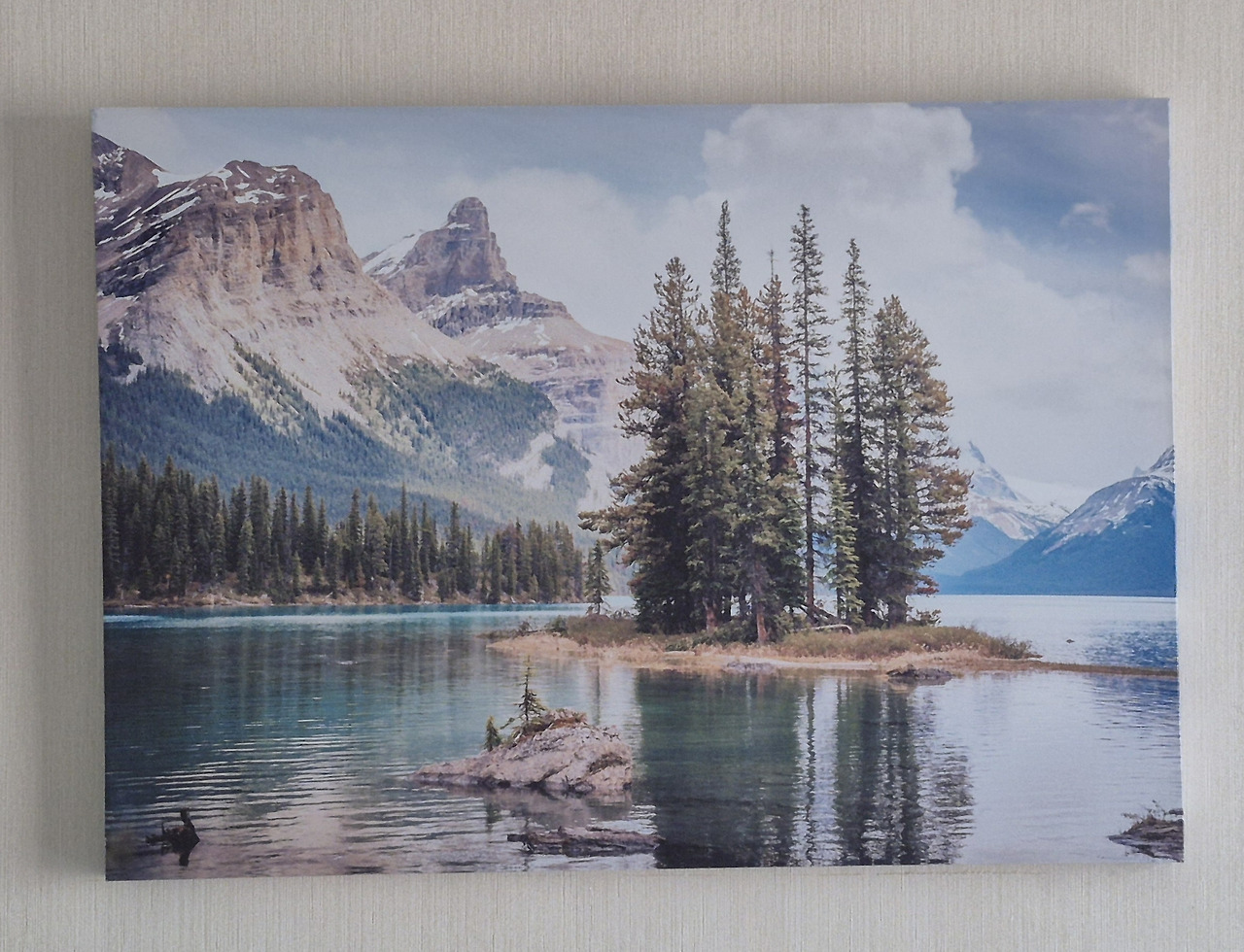 2주 이상 벌써 이곳에 머무르다 보니, 이제야 머리맡의 그림이 보였다. 왠지 낯이 익다. 2017년 5월 우리 가족이 방문했던, 로키의 루이스 호수 다른 쪽 끝까지 걸어가면 있었던 작은 섬 같다. 호수 속 작은 섬에, 내가 바지를 걷어 올린 채 막내를 업고 물을 건넜던 기억이 난다. 로빈슨 크로우가 된 양, 그 작은 섬을 탐험했었지. 동영상도 남겨 두었었다.
