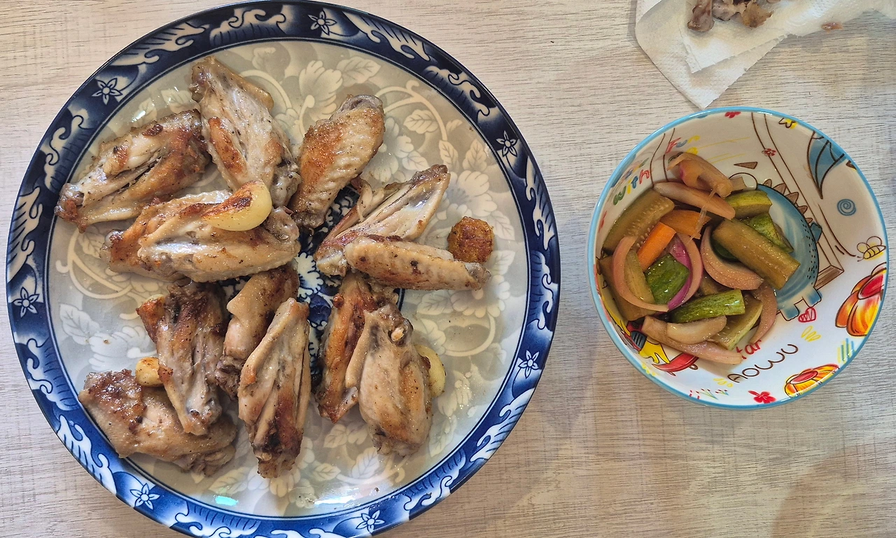 점심은 닭날개를 구워, 용관이 만든 오이피클과 함께 먹었다. 식전에 일부러 오이와 토마토 한 개씩을 먹었다. 이것으로 만족할 수 없던 우리들은 식빵과 잼과 땅콩버터와 바나나 등으로 고열량 폭탄을 만들어 먹었다. 그리고 룽안을 먹었다.
