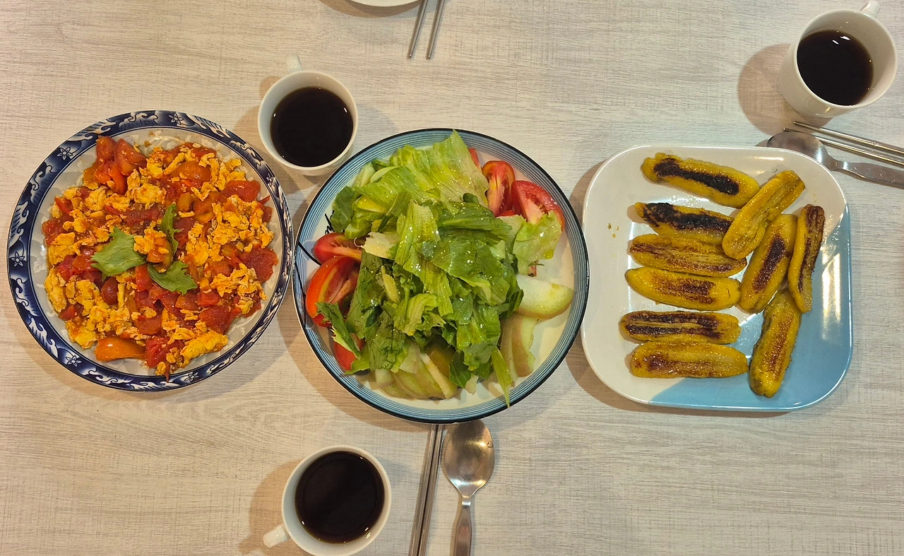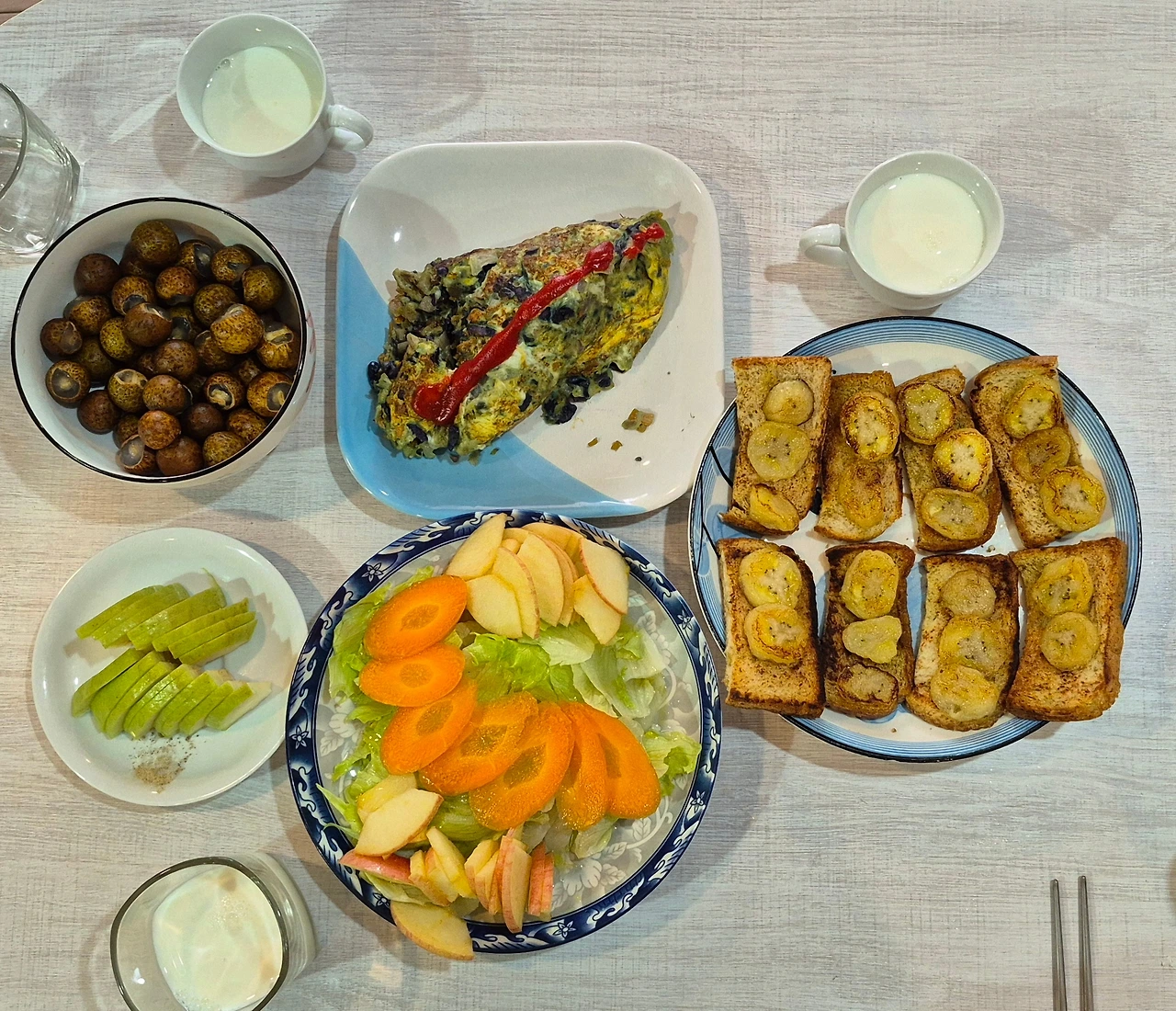 오믈렛을 만들어 보았는데, 늘 그랬듯 채소를 너무 많이 넣어서 모양이 잘 안 나왔다. 게다가 적양배추 때문에 푸른빛이 나서 더 그랬다. 용관은 바나나와 빵을 버터에 구워 토핑을 했다.