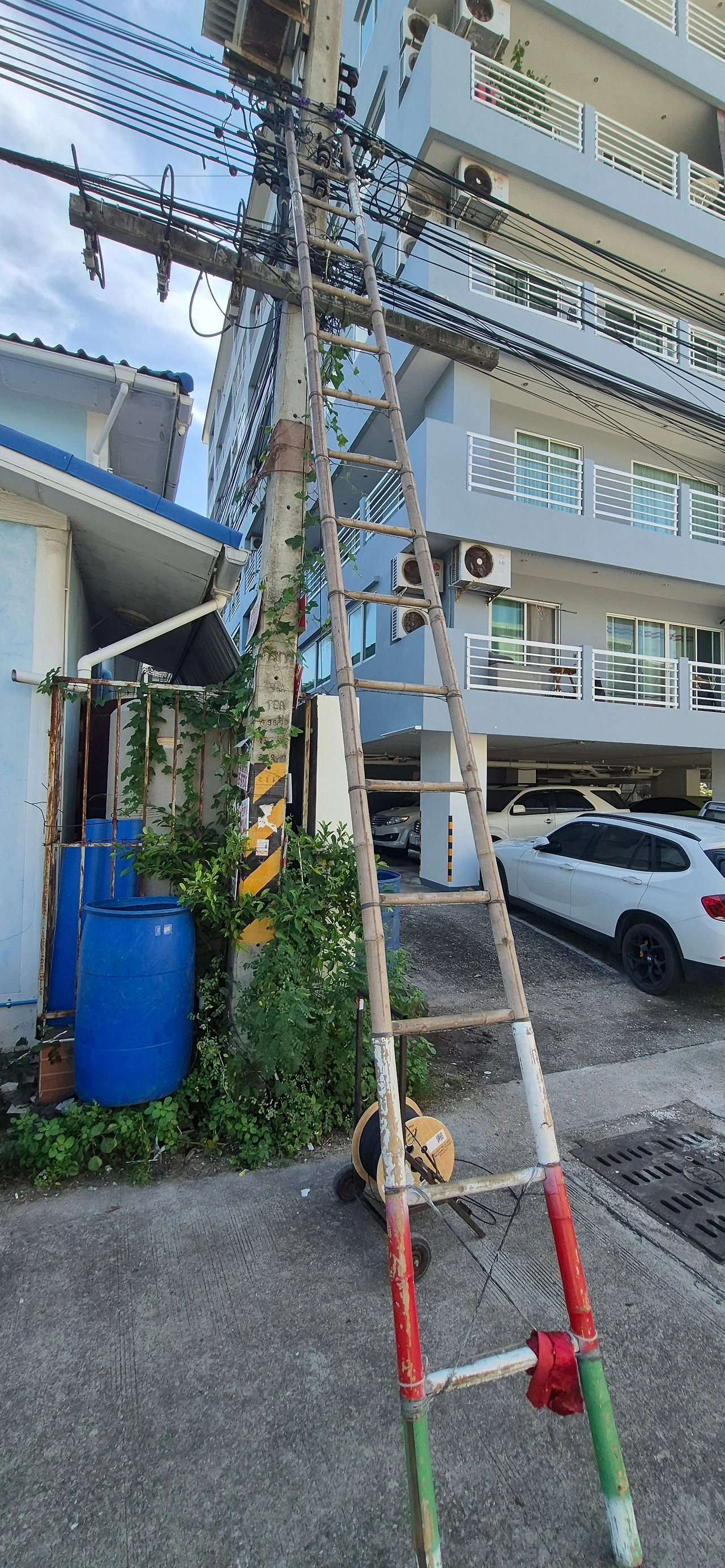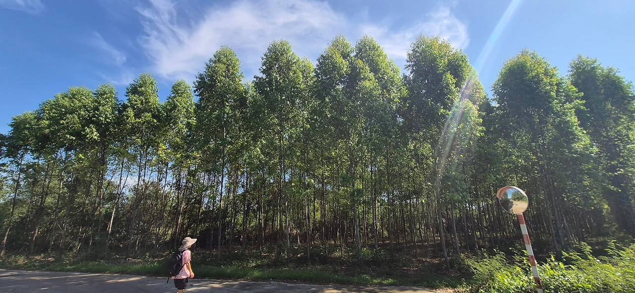 전봇대에 올라 작업하는 아저씨들이 보인다. 사다리가 특이하다. 대나무로 엮어 만든 사다리다. 그래, 이곳에서는 가벼운 대나무 사다리가 유용하겠다. 저번에도 보았던 유칼립투스 나무 조림된 숲이 보인다. 살랑살랑 유칼립투스 향기가 난다. 스페인 산티아고 길을 걷던 기억이 났다.