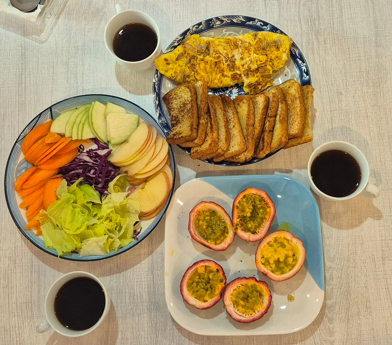 오늘 아침은 오믈렛이 나름 그럴듯한 모양으로 나왔다. 한국에서 먹던 해동한 패션푸르트는 너무 시어서 먹지 않았는데, 현지에서 생과일로 먹으니 아주 향긋하고 새콤하니 먹을만했다.
