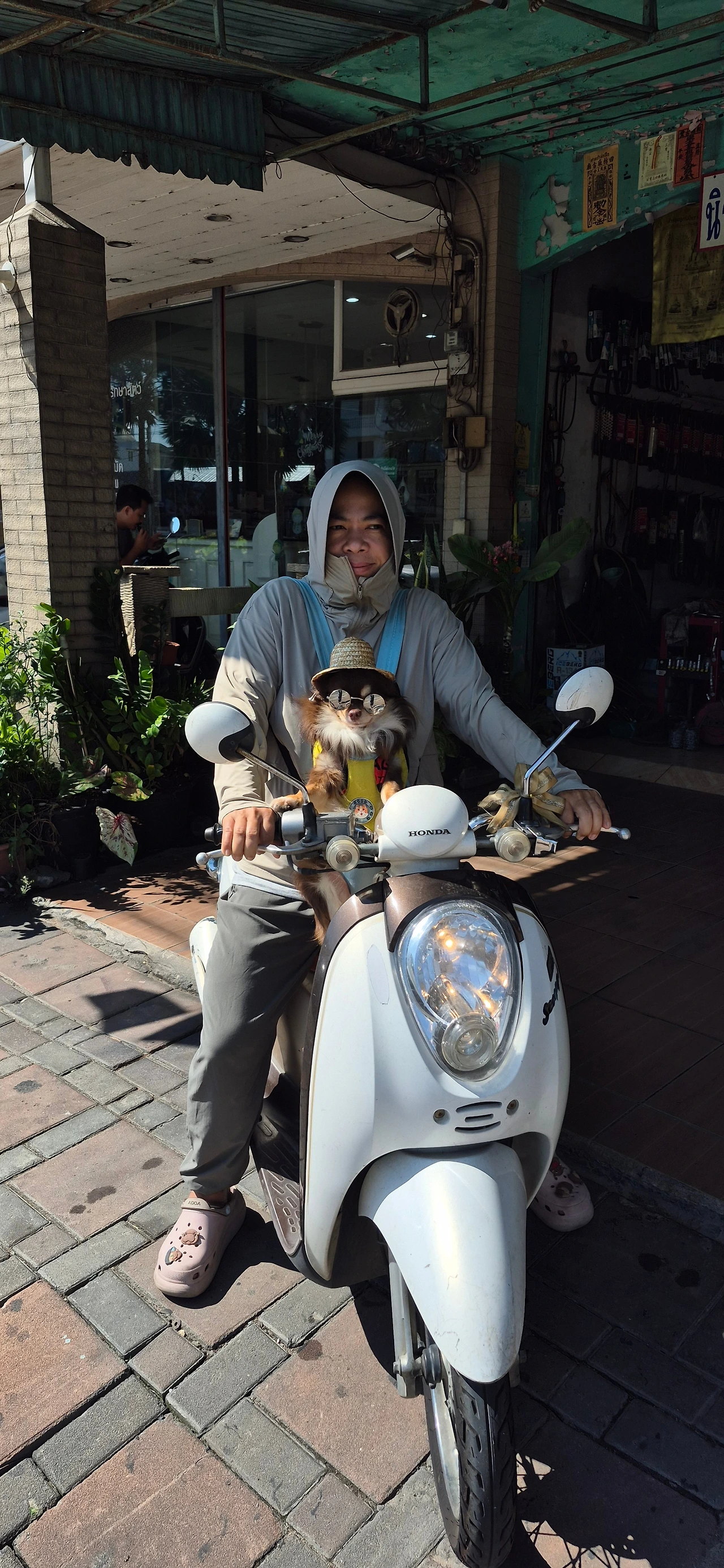 멋진 모자와 선글라스를 쓴 강아지를 태우고 다니는 한 태국 사람을 보았다. 너무 재밌어서 사진을 찍어도 되겠냐고 물으니, 흔쾌히 승낙한다. 여기 개들은 축 늘어져 있다. 아마도 땀구멍이 없어 더위를 힘들어하는 것 같다. 며칠 전에는, 땅을 파고 차가운 흙이 나오자 거기에 배를 깔고 눕는 강아지를 보았다.